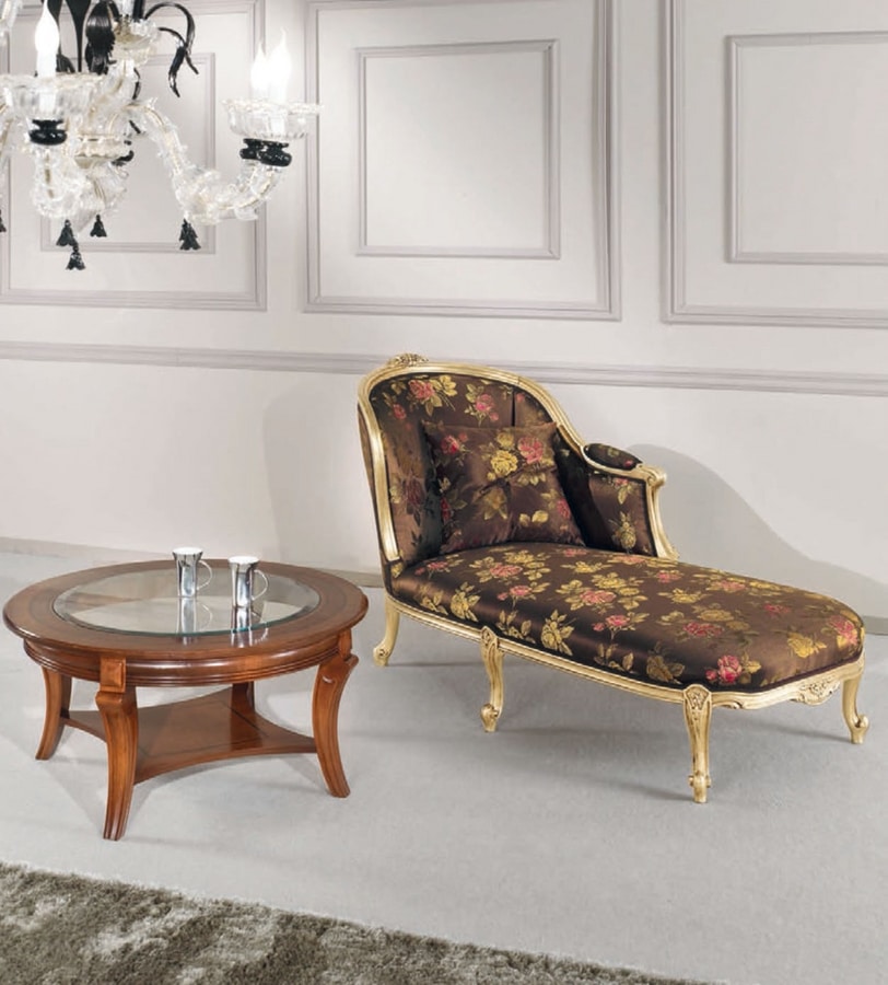 Provenza dormeuse mit geschnitzter Holzstruktur, mit Goldfinish. Stoffbezug mit Blumenmotiv.