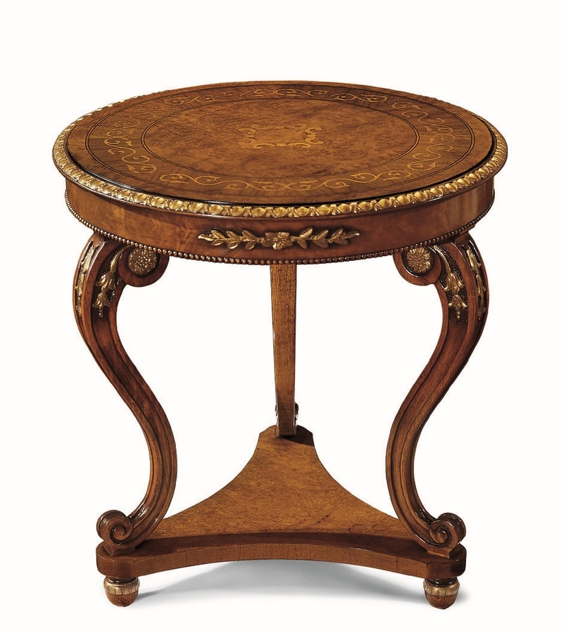 Runder Beistelltisch mit S-förmigen Beinen. Eingelegtes Oberteil.