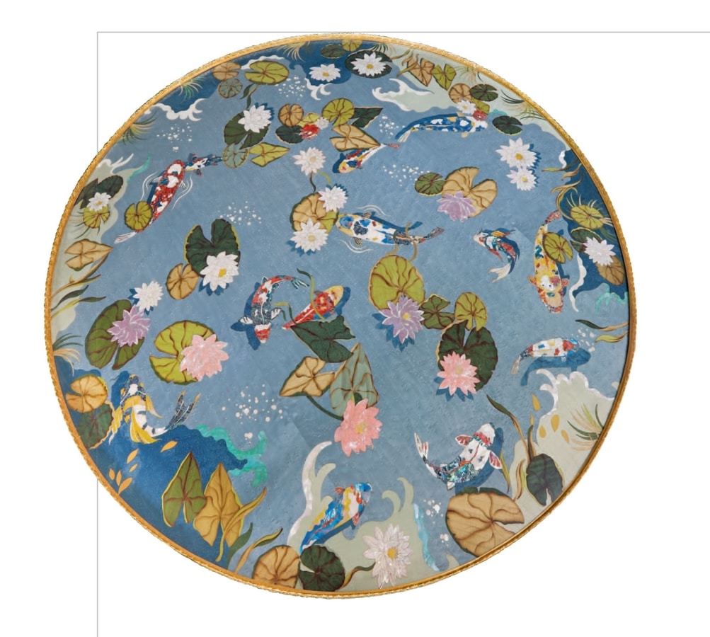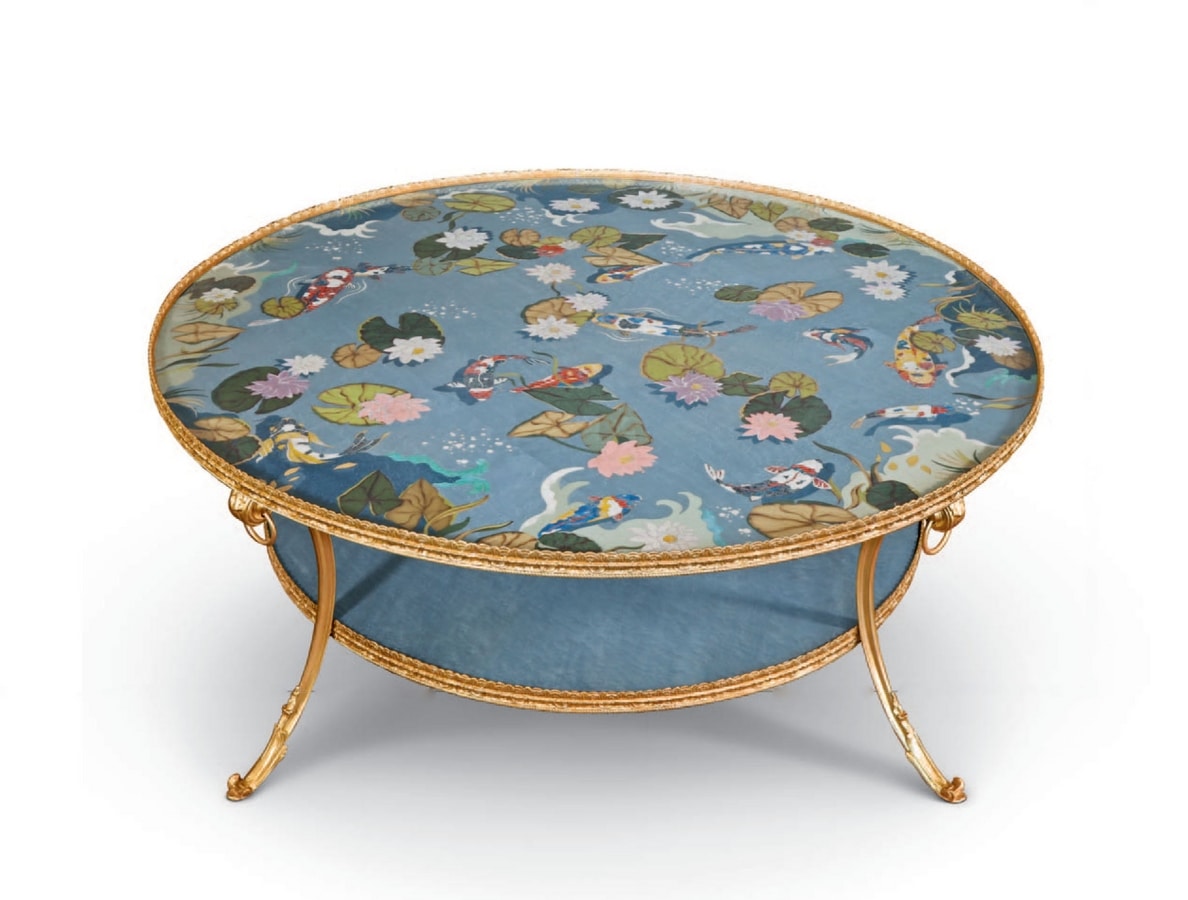 Runder Couchtisch von Ninfa mit goldener Messingbasis und farbiger Wurzel und Perlmutt eingelegter Platte.