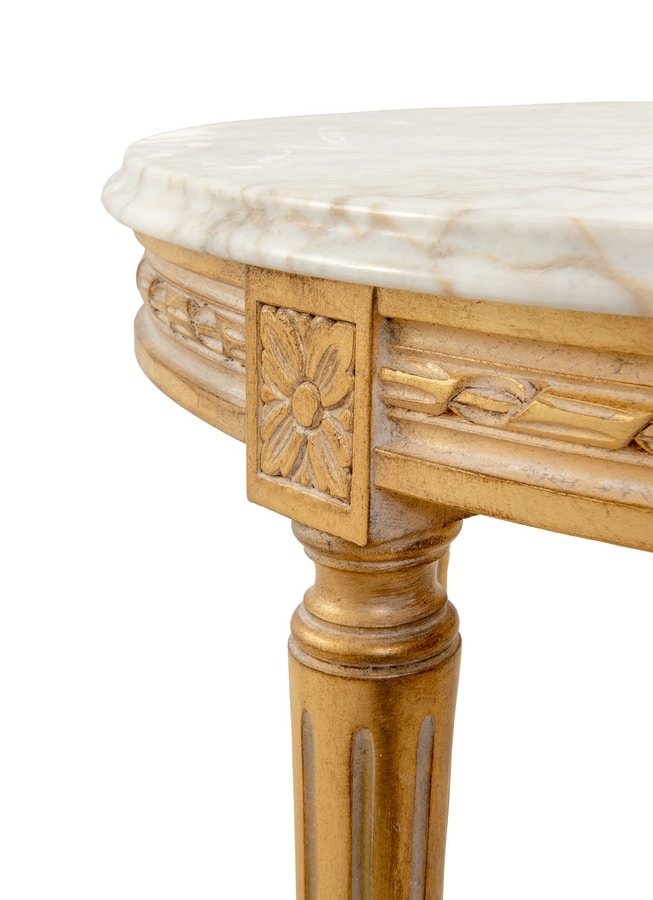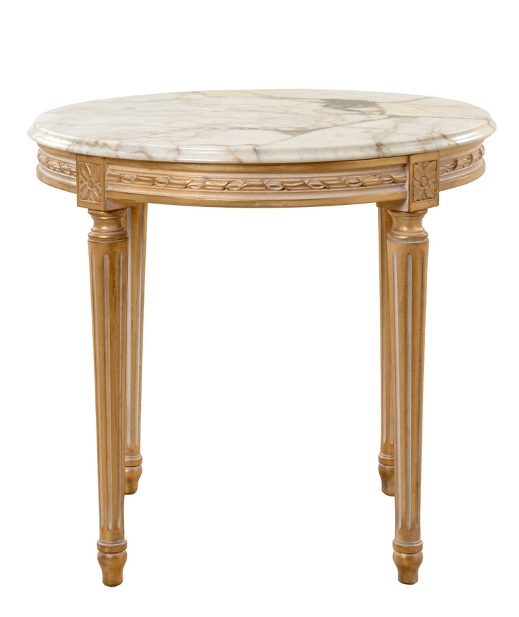 Beistelltisch mit Marmorplatte Calacatta Gold, Gestell aus geschnitztem Holz mit OCH-Blattgold-Patinierung und weißem Baiser (Oro Chic).