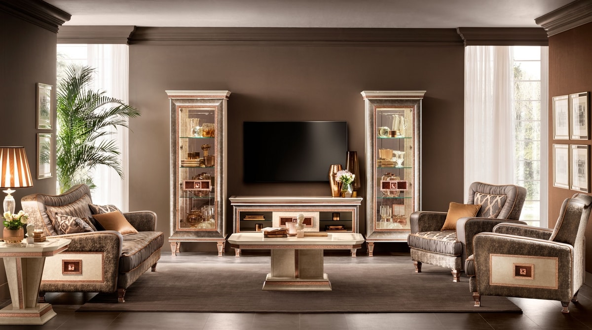 Arredoclassic präsentiert Dolce Vita, eine brandneue Kollektion, die an die typischen geometrischen Linien und den Detailreichtum des Art-déco-Stils erinnert. Elegante Details, wie die Rahmen in Roségold-Finish, bereichern die Raffinesse der klaren und strengen Formen. Das Dolce Vita-Konzept wurde entwickelt, um Ihr Zuhause mit Eleganz auszustatten und ihm diesen raffinierten Hauch von Design zu 100 % Made in Italy zu verleihen, der ein hochwertiges Produkt garantiert.