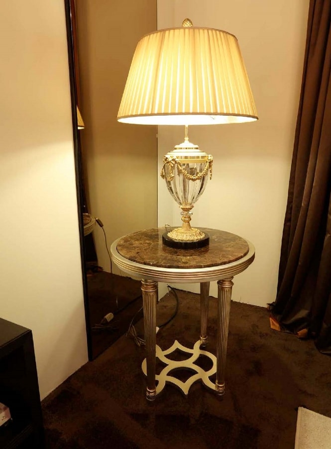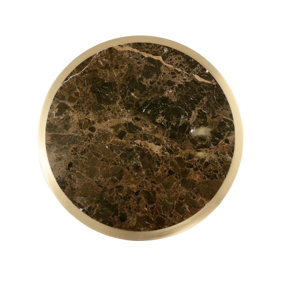 Die Tischplatte hat eine Marmorplatte oder einen bronzierten Glaseinsatz.