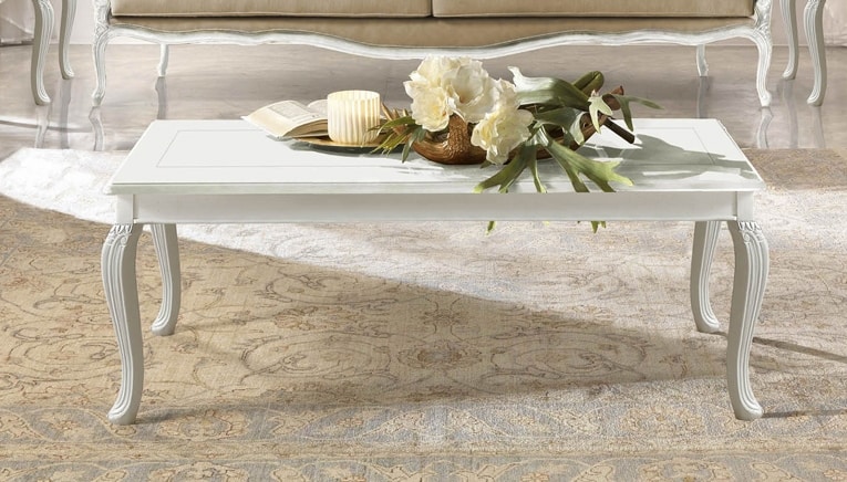 Rechteckiger Couchtisch im klassischen Stil mit geschnitzter Holzstruktur und eingelegter Platte.