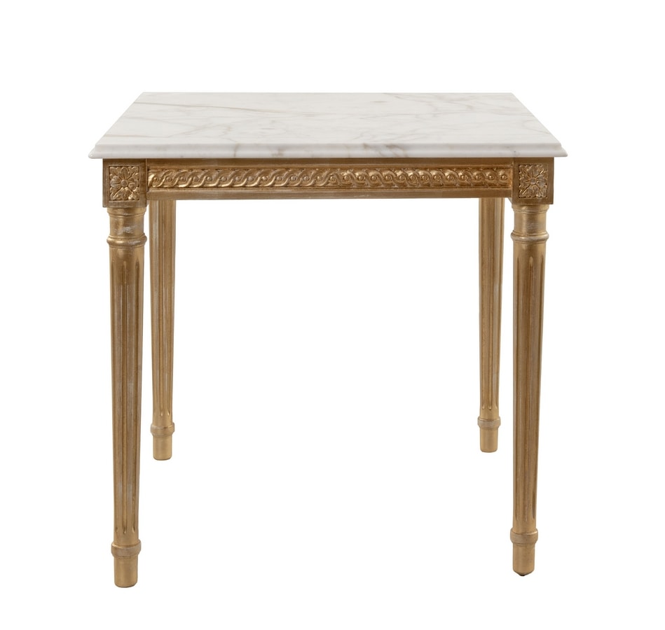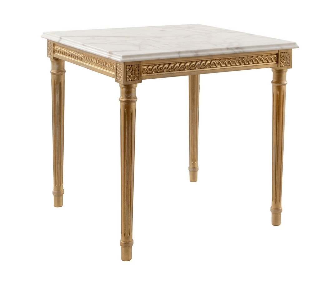 Beistelltisch im Louis XVI-Stil mit Marmorplatte Calacatta Gold, kombiniert mit gebürstetem OR5-Blattgold und weißem Baiser-Untergestell.