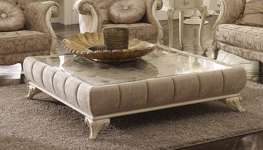 Gepolsterter Couchtisch mit Glasplatte