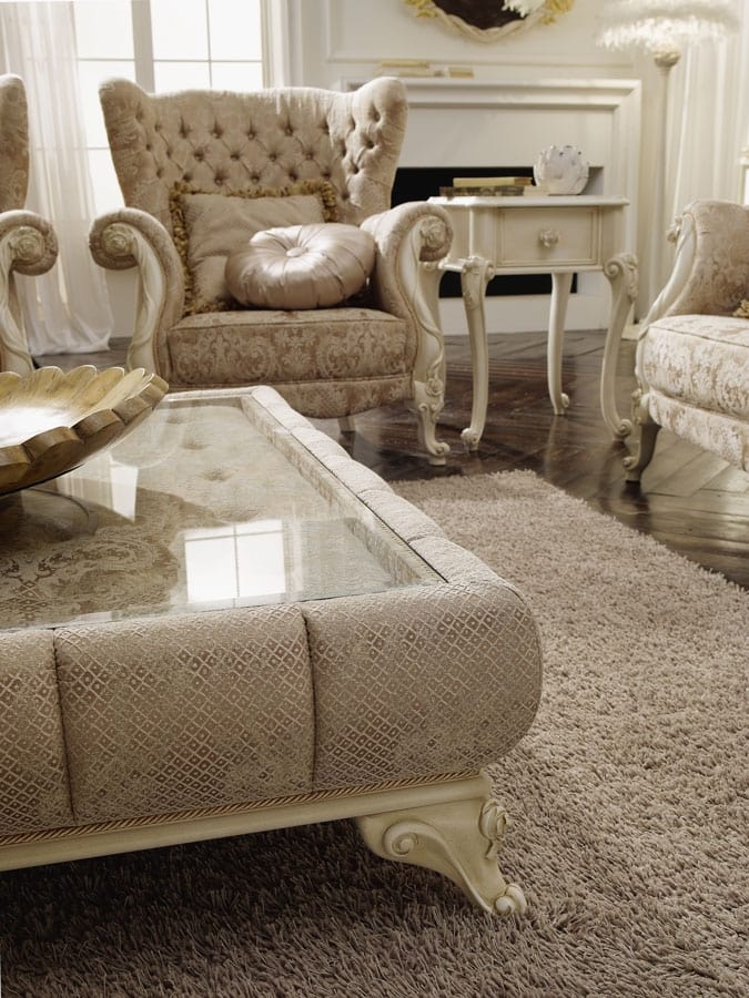 Klassischer Couchtisch mit Glasplatte. Gepolsterte Seiten und geschnitzten Holzfuß.