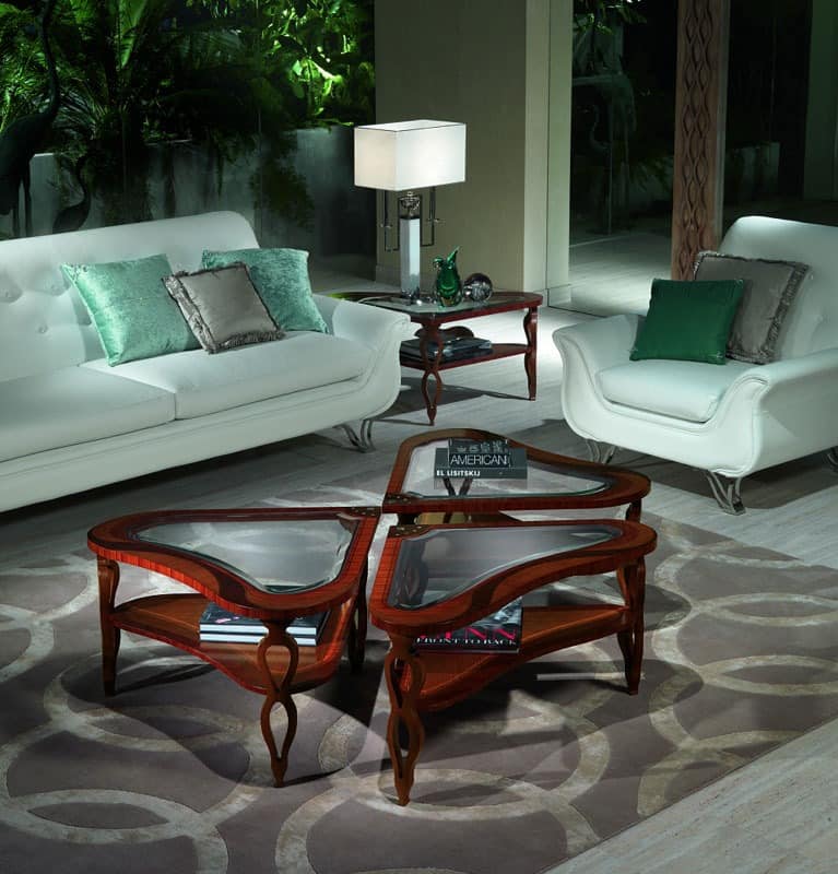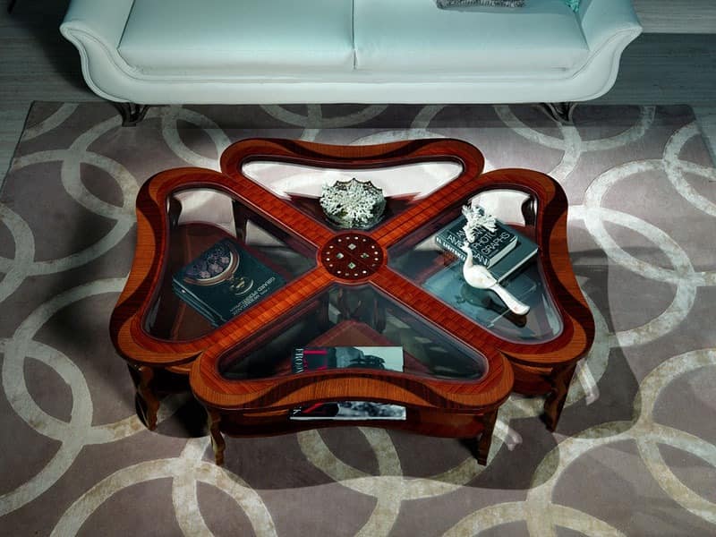 Couchtische aus Holz in zwei Größen erhältlich. Die vier Teile der Komposition sind einzeln oder kombiniert angewendet werden, um eine "Kleeblatt" Zusammensetzung 150x114x48 cm h) zu schaffen. Die Struktur ist aus Eiche, Palisander und Rosenholz mit Hand-Set Shell-Einsätze. Die untere Fläche ist in Eiche mit Palisander umgeben. Die Tischplatten sind auch in Rosenholz. Top Oberfläche mit abgeschrägten Glas.