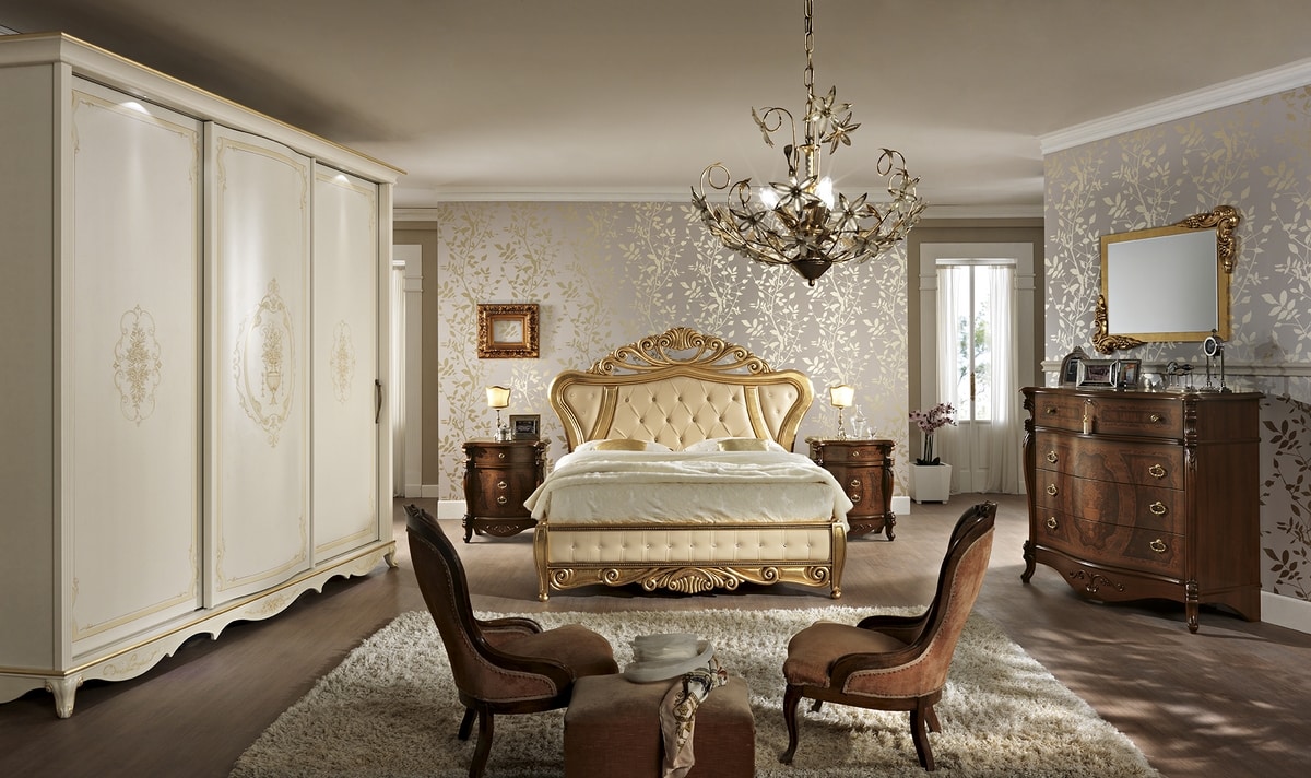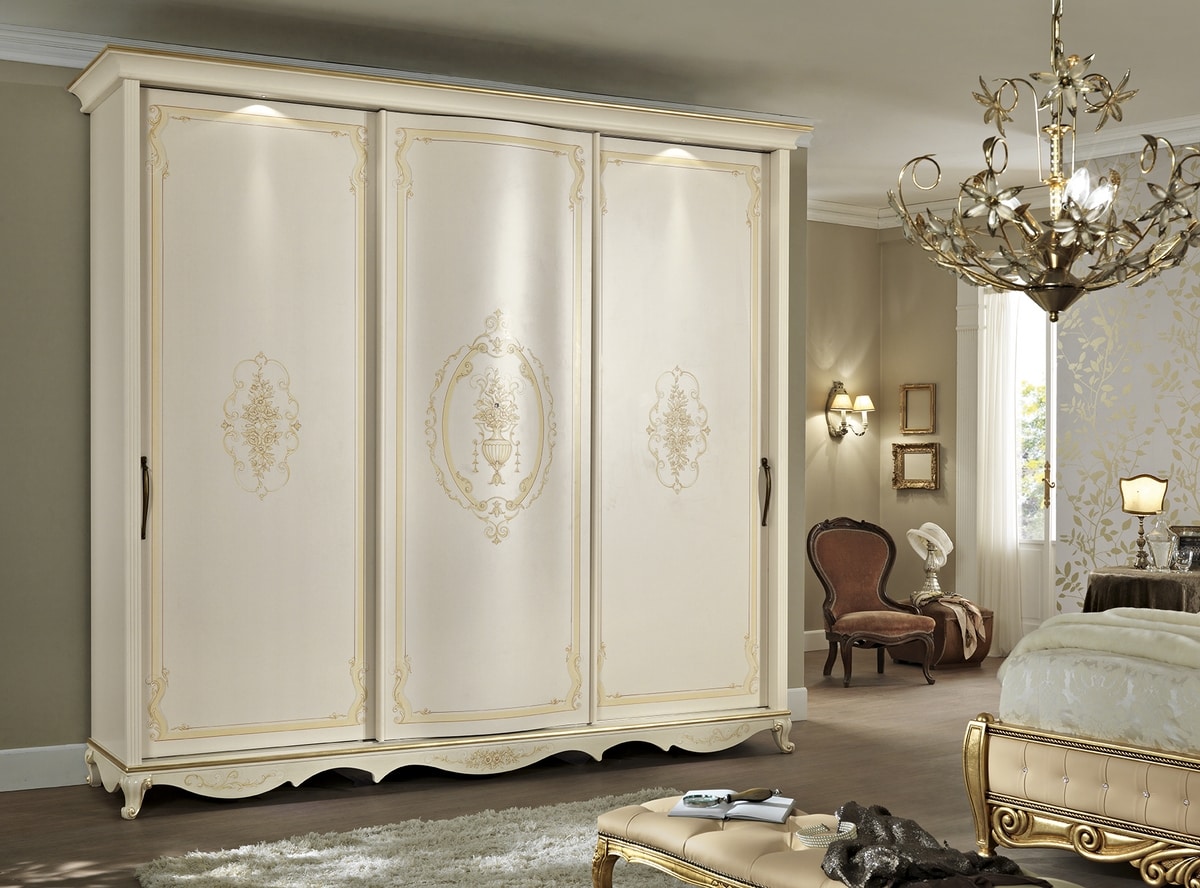 Klassischer Kleiderschrank, Schiebetüren, patiniert und dekoriert