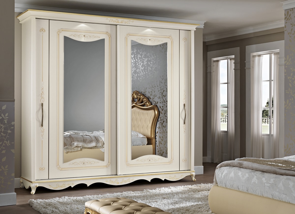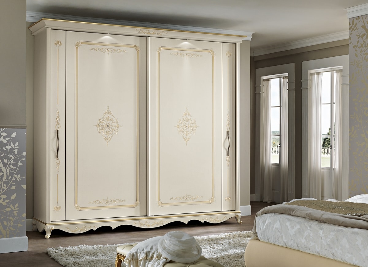 Der Kleiderschrank Angelica, 2 Schiebetüren ist patiniert und verziert. Die Türen werden in jedem Detail ausschließlich von Hand bearbeitet!Möglichkeit, sie mit Spiegeln zu bereichern.