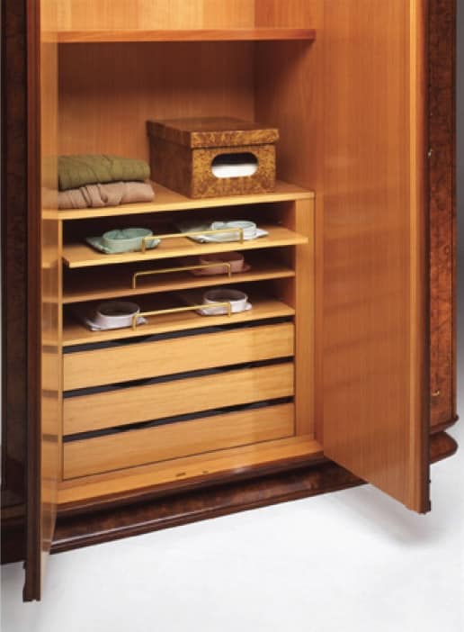 Sechs Türen Kleiderschrank mit Schnitt, graviertes Glas, Deckel und Boden in Zebrano Massivholz, Schubladen innen.