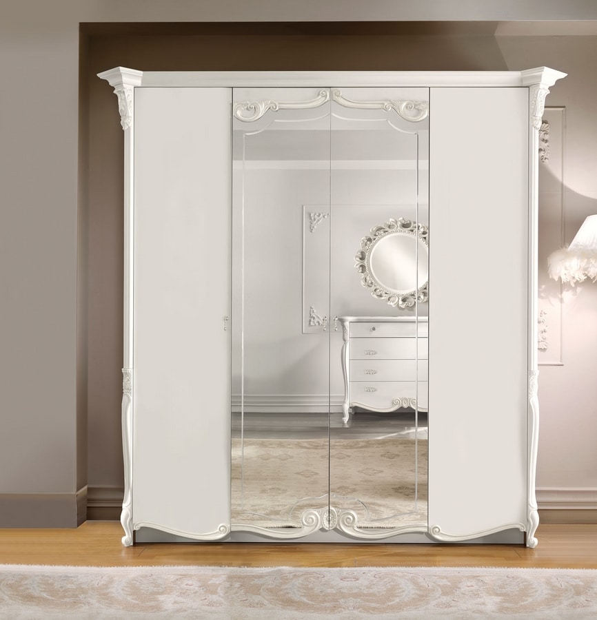 4-türiger Kleiderschrank aus lackiertem Holz mit 2 zentralen Außenspiegeln. Einschließlich interner Regale und Kleiderbügelrohre.