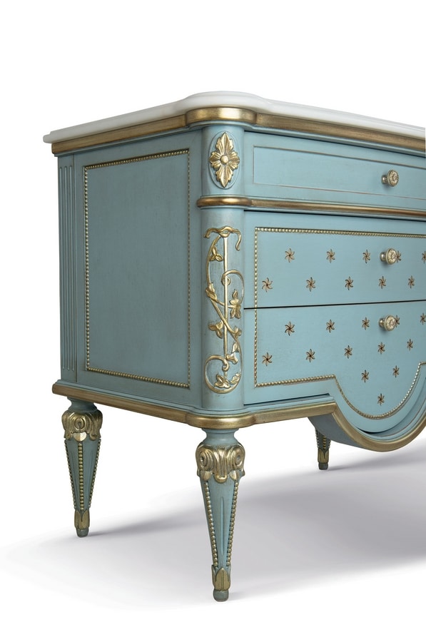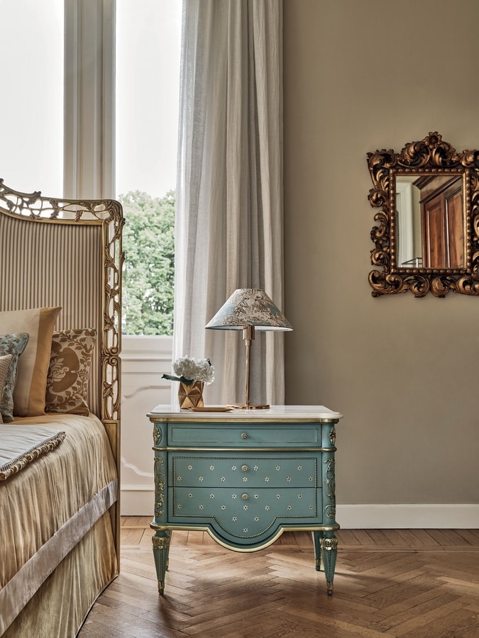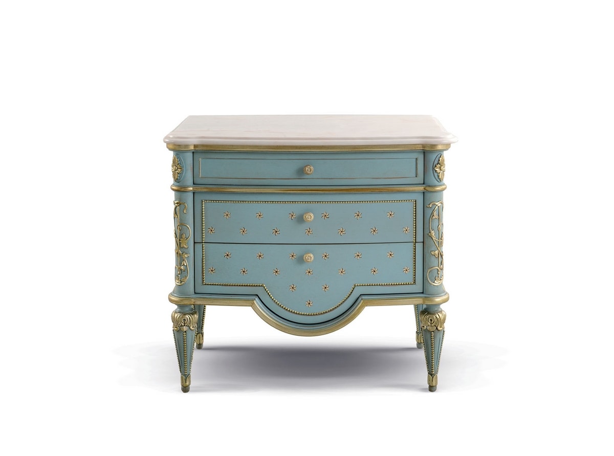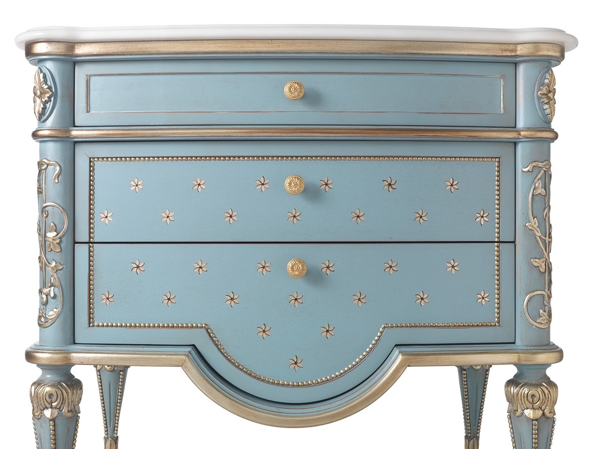 Nachttisch mit geschnitzten Elementen, Marmorplatte Rosa Portogallo Estremoz, fertig lackierter gebürsteter Anis mit Details in Blattsilber und handgemalten Dekorationen.