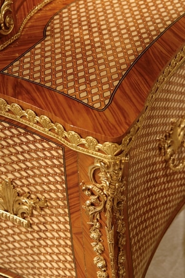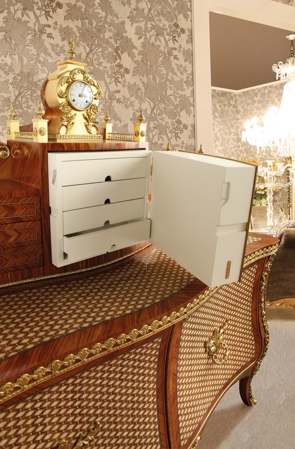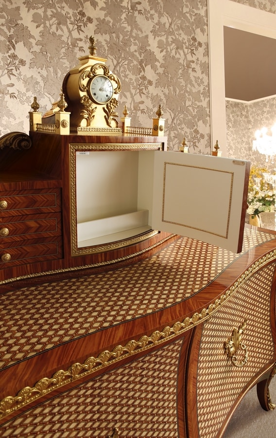 Klassisches Luxus Sideboard. Kommode aus Bois de Rose mit reichem Intarsien-Inlay. Dieses Luxusstück mit eleganter Linie wird durch das Auftragen von sehr feinen Bronzen in Goldfinish abgerundet. Auf dem oberen Teil, der aus mehreren kleinen Schubladen besteht und in dem ein Sekretär versteckt ist, ruht eine schöne Uhr mit einem manuellen Mechanismus.
