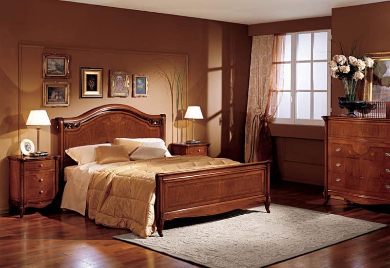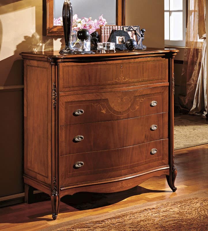Luxury klassische Kommode in Nussbaum mit 4 Schubladen Verriegelung Schwalbenschwanz. Schnitzereien und Intarsien komplett von Hand gefertigt. Wachs Finish. Auch mit Klappe, Marmorböden und Details in Gold oder Silber Blatt.