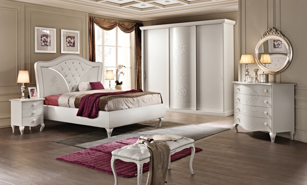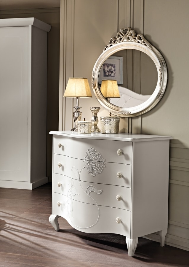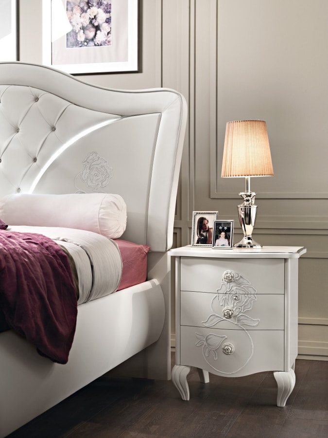 Brigitte Kommode und 2 Nachttische in mattweißem Lack, von Hand bemalt und verziert. Details in Blattsilber auf den Oberteilen und swaroskyfarbener Lichtpunkt auf den Dekorationen. Schubladen mit Blumotion-Führungen, sanftes Schließen.