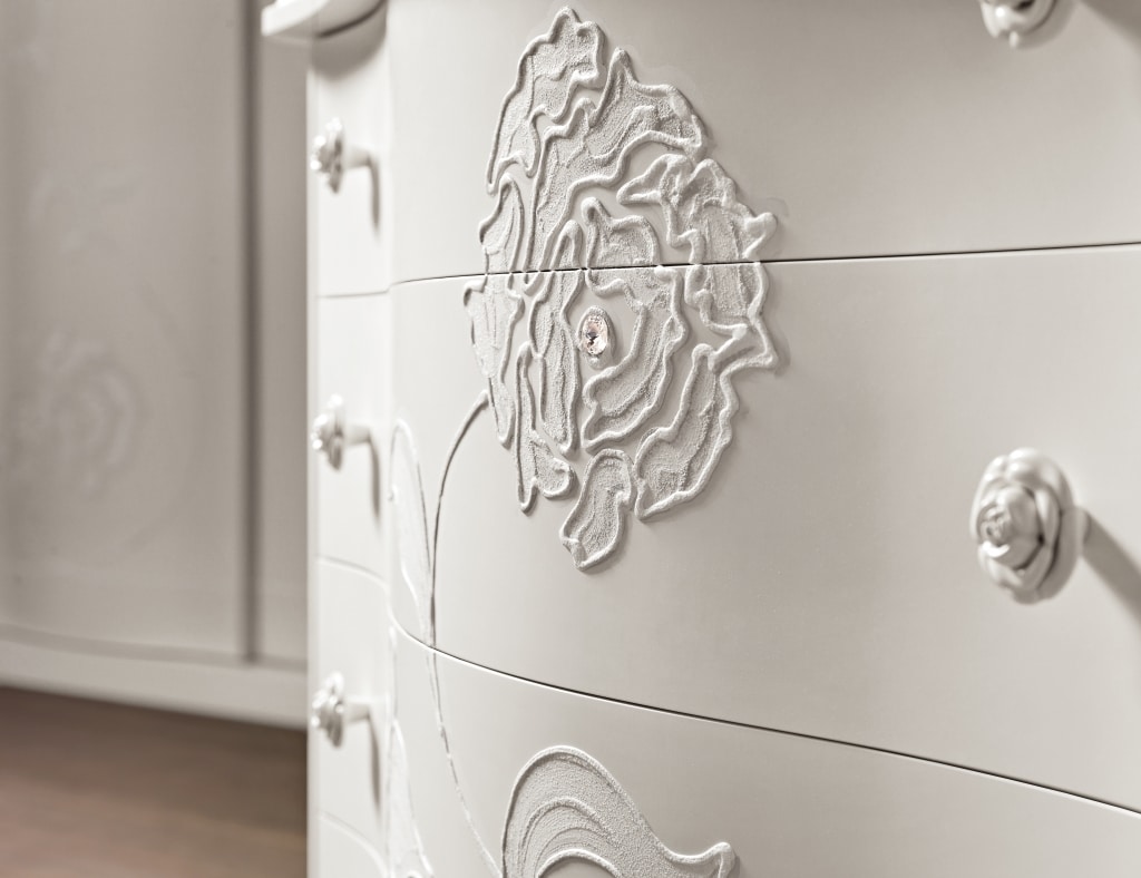Kommode und Nachttisch mit feinen handgefertigten Dekorationen