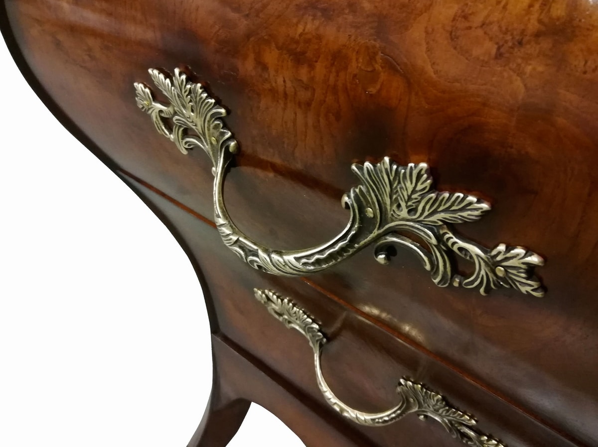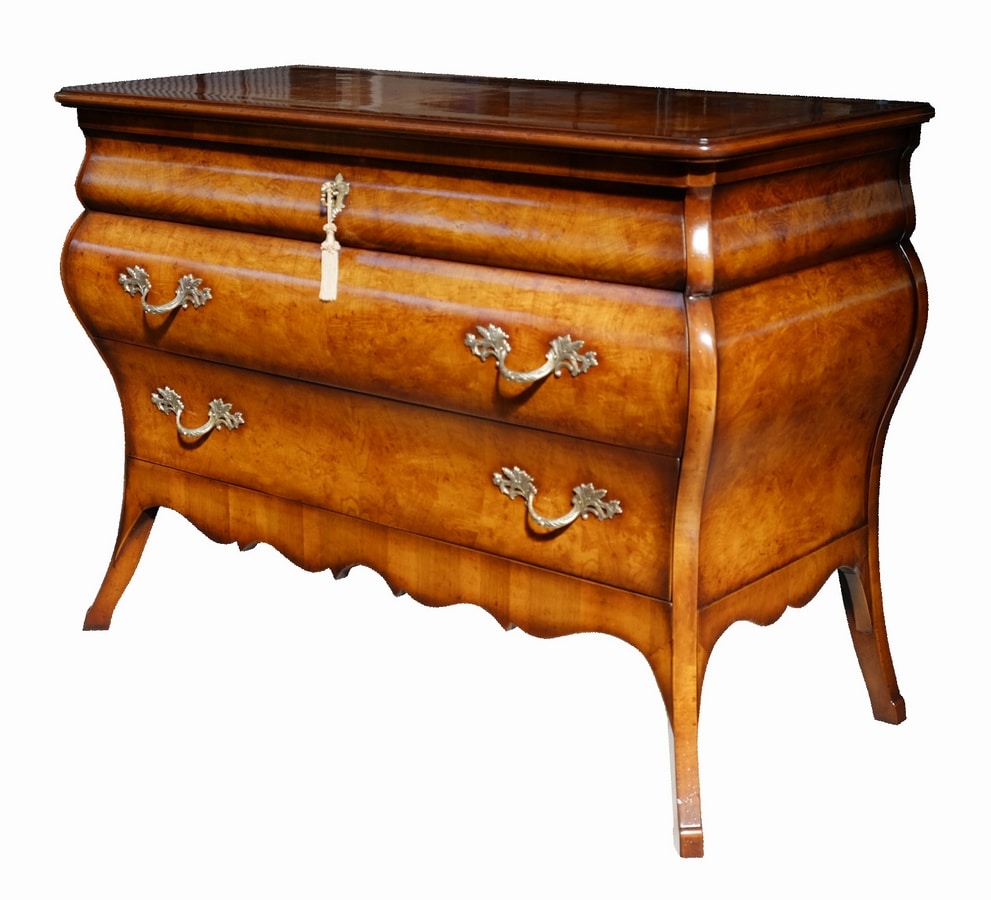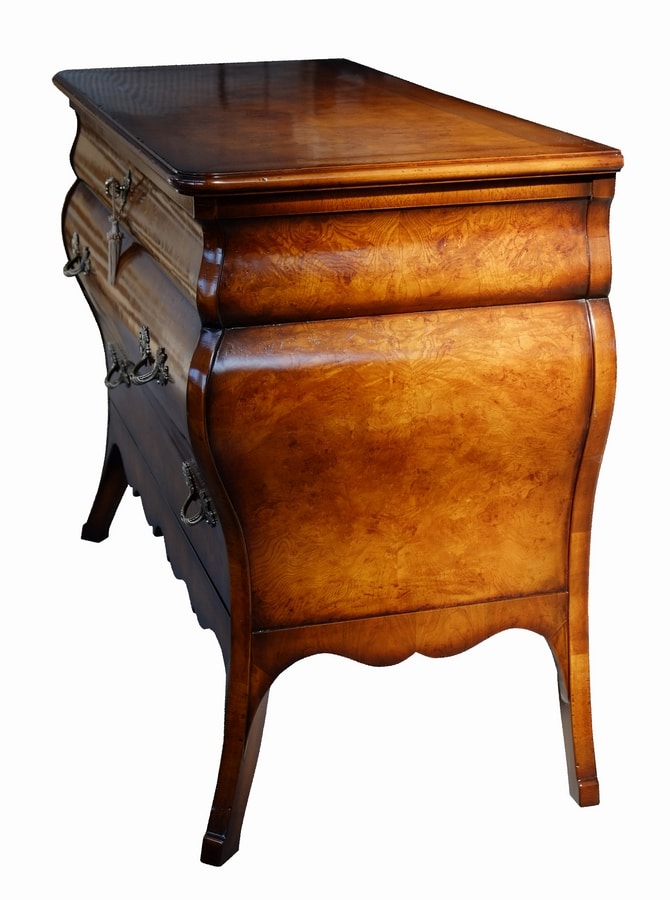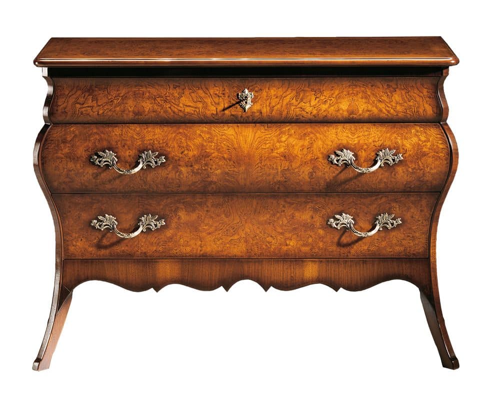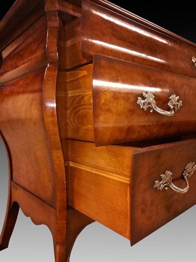 Geformte Kommode aus Wurzelholz aus olivgrüner Esche, inspiriert vom lombardischen Stil des 18. Jahrhunderts, eine originalgetreue Reproduktion des Originals. In drei Schubladen unterteilt, mit geformten Seiten und vorne mit einer doppelten Kurve. Die Beine zeigen nach außen, verbunden durch eine mixtilineare Schürze aus italienischem Walnussholz.
