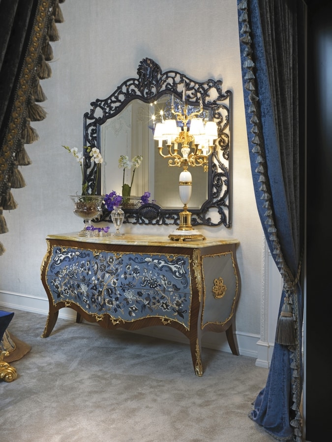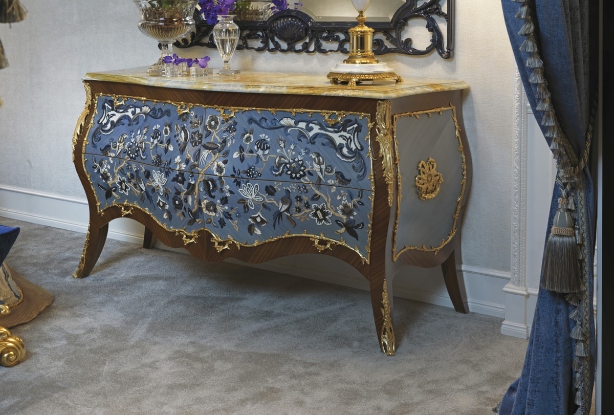 Preise anfordern Ähnliche ProdukteLuxuriöse klassische Kommode aus Palisander mit reliefierten Intarsien und Messing in patiniertem Goldbad, Onyx - Topblau "ICE AGE". Die Kommode wird von den Nachttischen und der Kommode begleitet und mit dem mit blauem Samt bezogenen Bett kombiniert erinnern an die Töne der Intarsien Unsere Kollektion von klassischen Schlafzimmern ist mit Betten, die von erfahrenen Händen fein geschnitzt sind, mit Oberflächen in Gold oder Silber angereichert Unsere luxuriösen klassischen Schlafzimmer sind in verschiedenen Stilen hergestellt, um die breiteste Kundschaft zu befriedigen Eine sorgfältige Auswahl der Materialien und Endbearbeitungen zeichnen unsere Kollektionen aus.