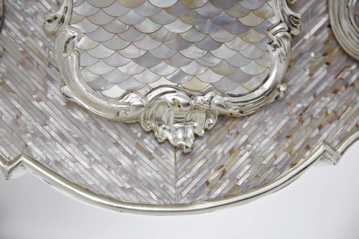 Die blumigen Inlays tauchen stetig auf, und ihre aufwändigen Bände lösen sich in der glatten Perlmutt-Chips-Oberfläche auf, und alle kommen anmutig zusammen.