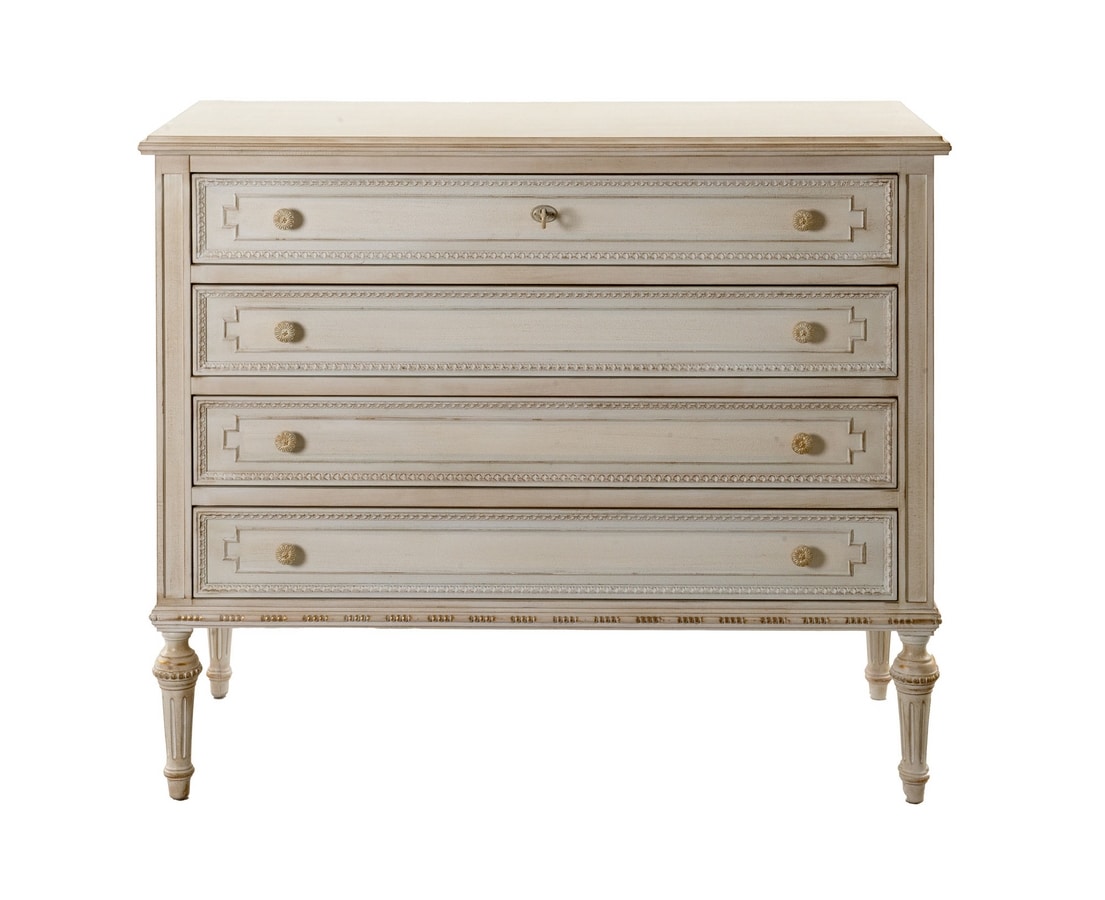 Klassische Kommode mit LAFM-Lackierung in gebürstetem französischem Temperaweiß und Blattgoldbasis.