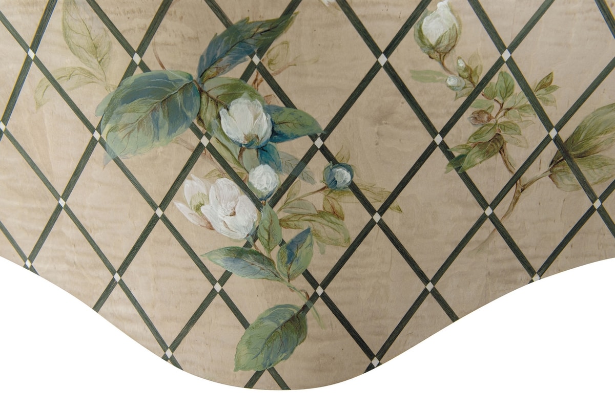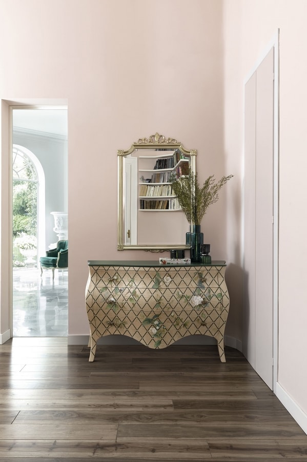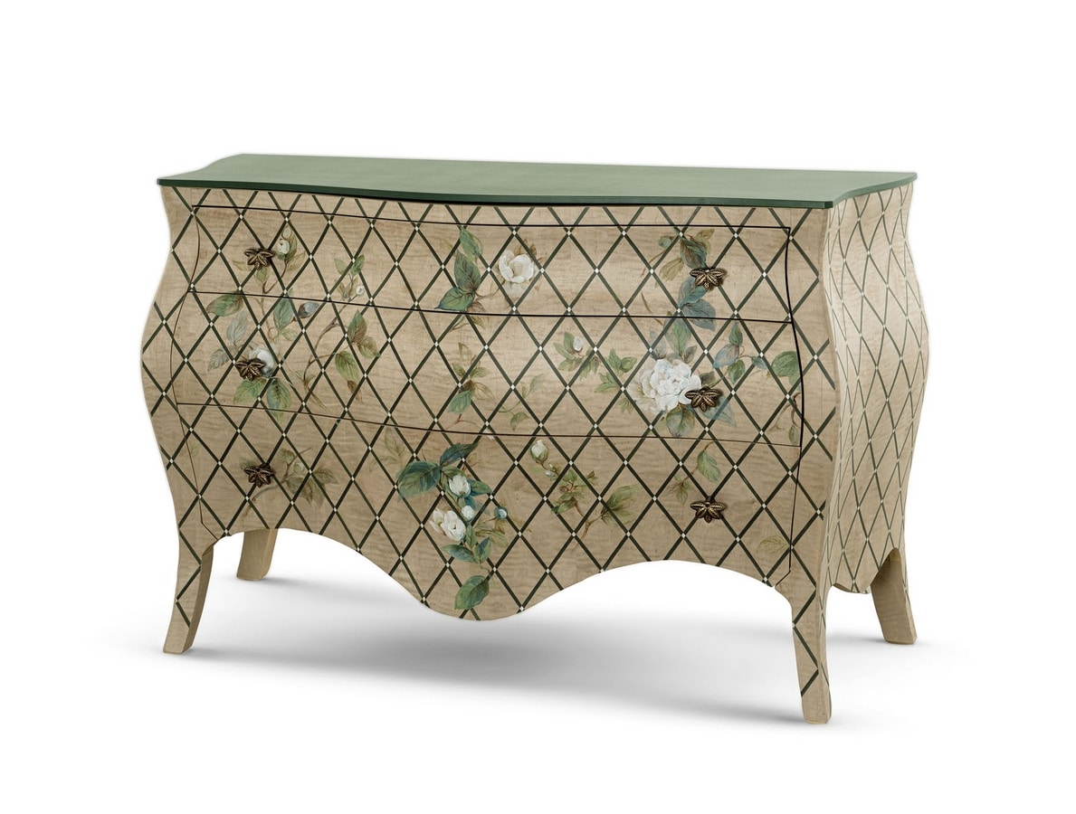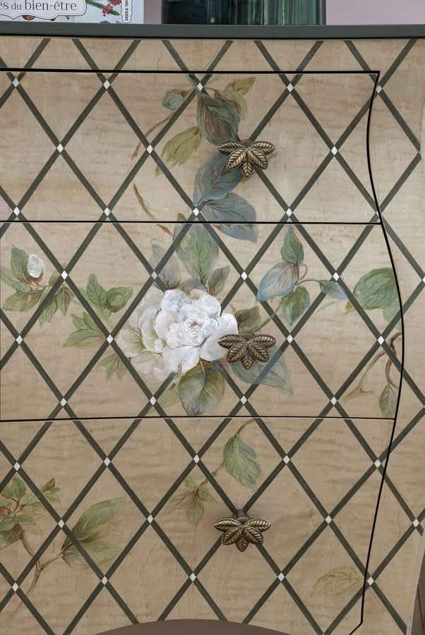 Kommode furniert mit Ahornfries mit Einlagen aus Perlmutt und Rombprifile aus Tay-Furnier, mit handgemaltem Blumendekor, Platte aus lackiertem Glas in grünem Lotus, mit dekorativen Messinggriffen.