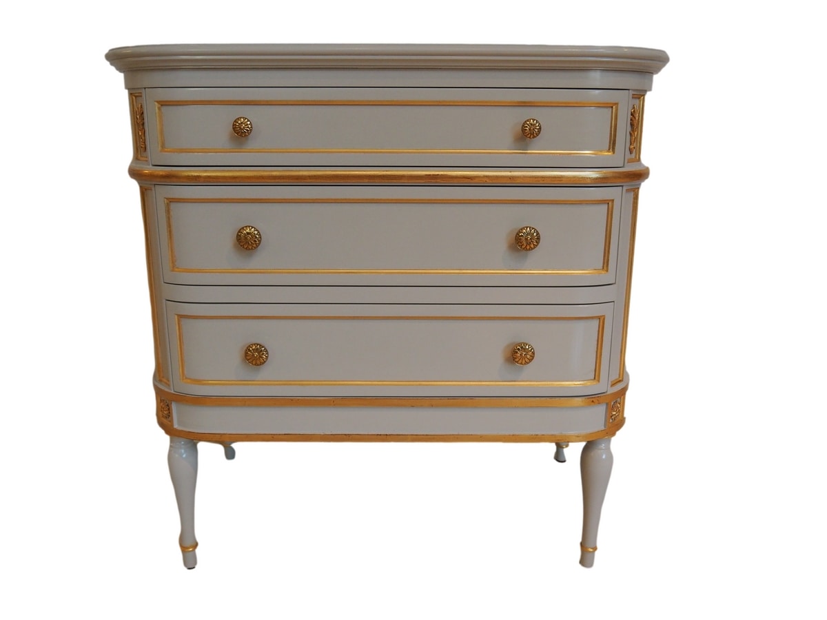 Kleine Kommode aus geformtem Holz mit Schubladen im französischen Stil, glänzend lackiert, Anwendung von handgeschnitzten Friesen mit Blattgold- oder ähnlichen Blattgoldoberflächen. Platte aus Marmor oder Holz mit Kunstmarmor verziert.