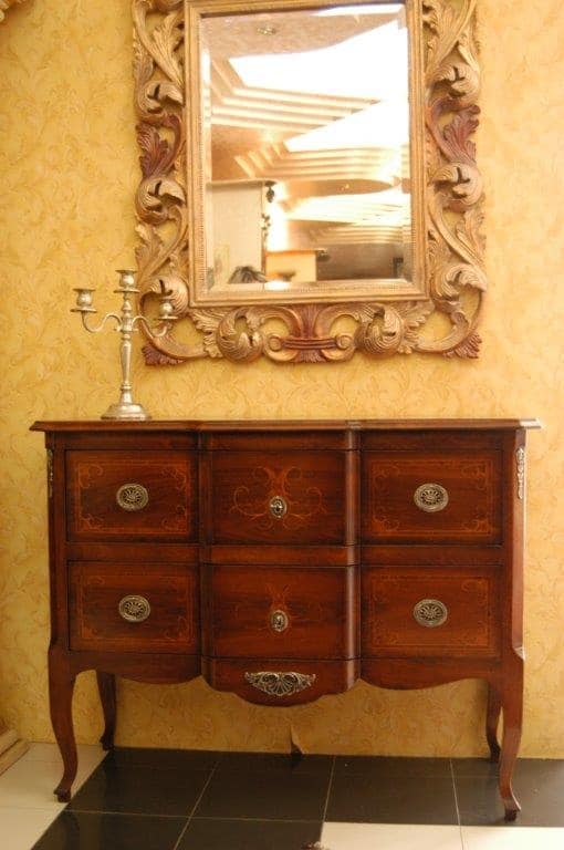 Klassische Kommode, für Eingang, Nussbaum-Finish. Mit 2 Schubladen und mit kostbaren Einlagen auch auf der Oberseite. Brushed Messing Friese, ideal für jede häusliche Umgebung.
