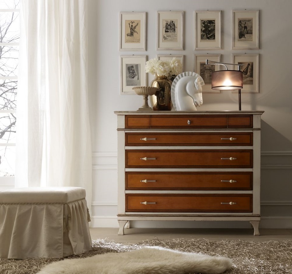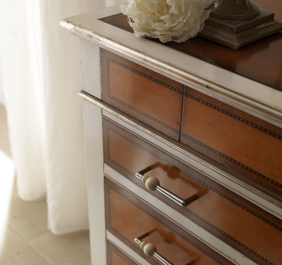 Kommode aus Holz. Handgearbeitete Dekoration, patiniertes, weiß lackiertes Finish, Kirschholz und echte Blattsilberdekorationen.
