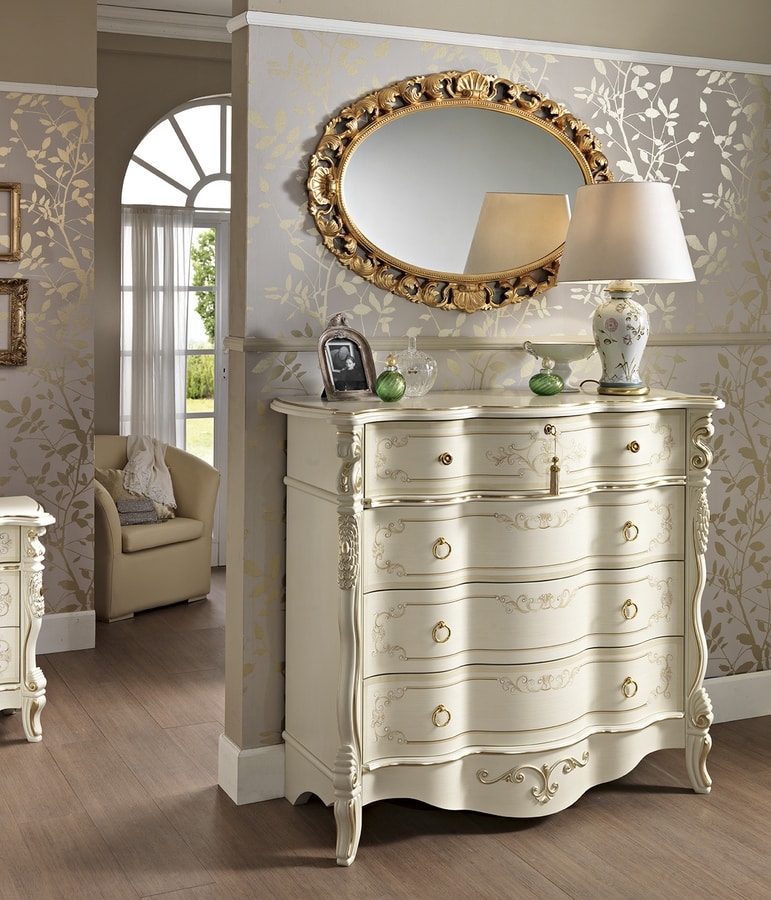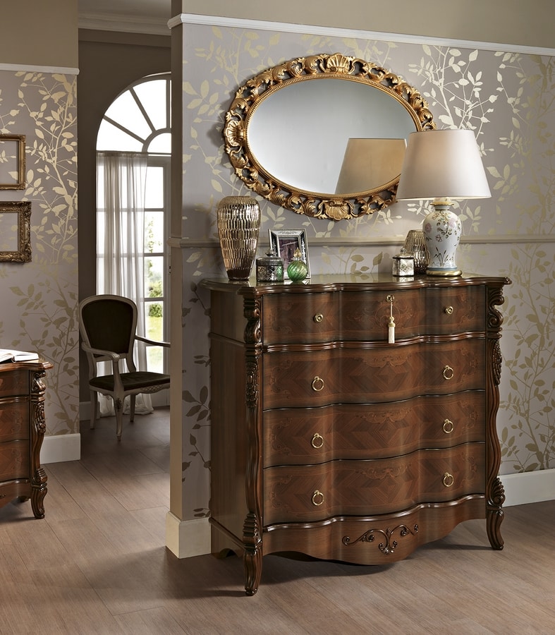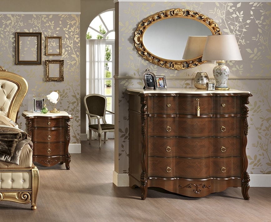 Die Triptychon-Kommode und Nachttische zeichnen sich durch ihre geschwungene Front aus und sind in den beiden Varianten Nussbaum und patiniert erhältlich, immer mit Details und Dekorationen von unseren Dekorateuren!