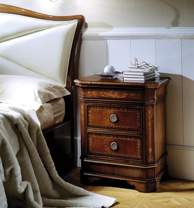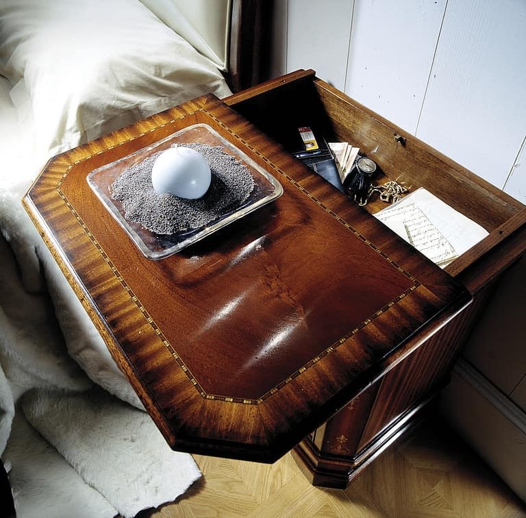 Die Kommode und Nachttische der Villa Ca 'Cornaro sind aus Holz mit Mahagoni-Veneers in Mahagoni und eingelegten Dekorationen. Charakteristisch für die erste Schublade der Kommode ist die Anwesenheit einer Schmuckschatulle mit Spiegel. Der Nachttisch kann geöffnet werden.