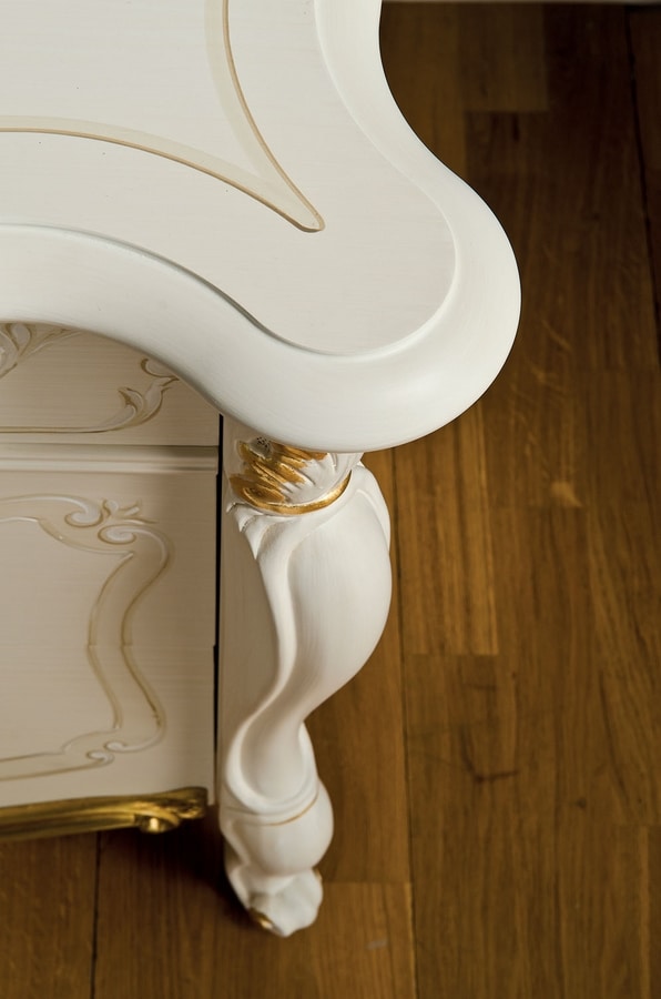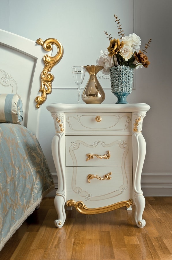 Klassischer Nachttisch aus Holz mit dekorativen Blattgolddetails.