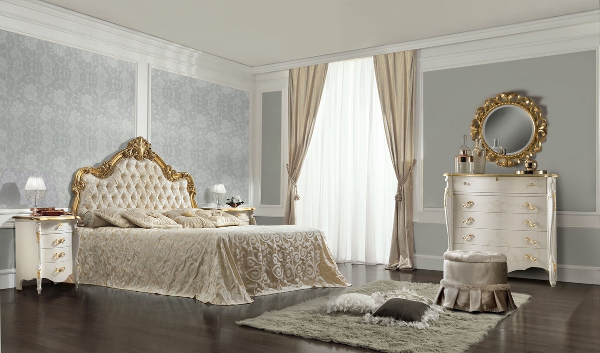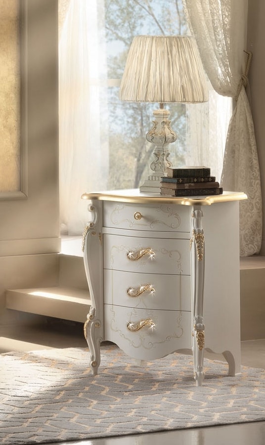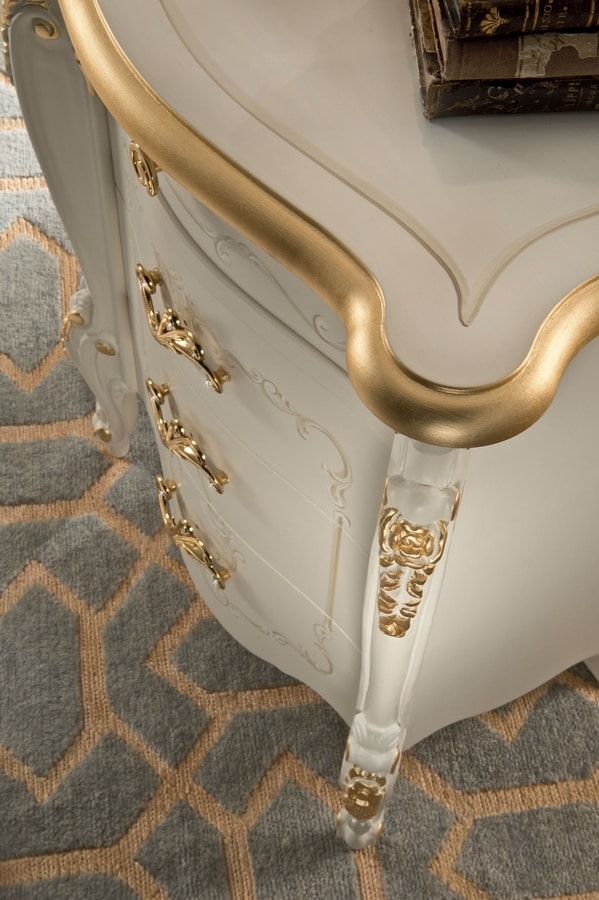 Nachttisch mit 4 Schubladen aus lackiertem Holz mit Blattgolddetails.