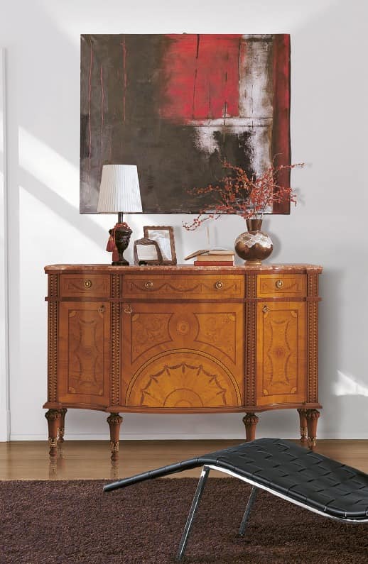 Anrichte Luxus, Holz, Intarsien 3 Türen und 3 Schubladen, Marmor