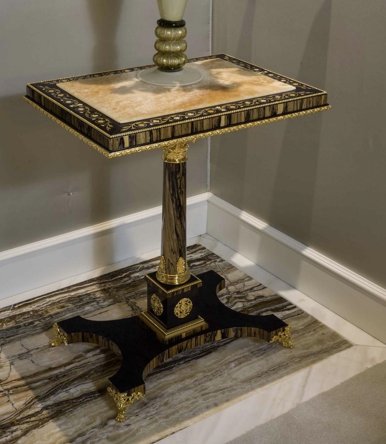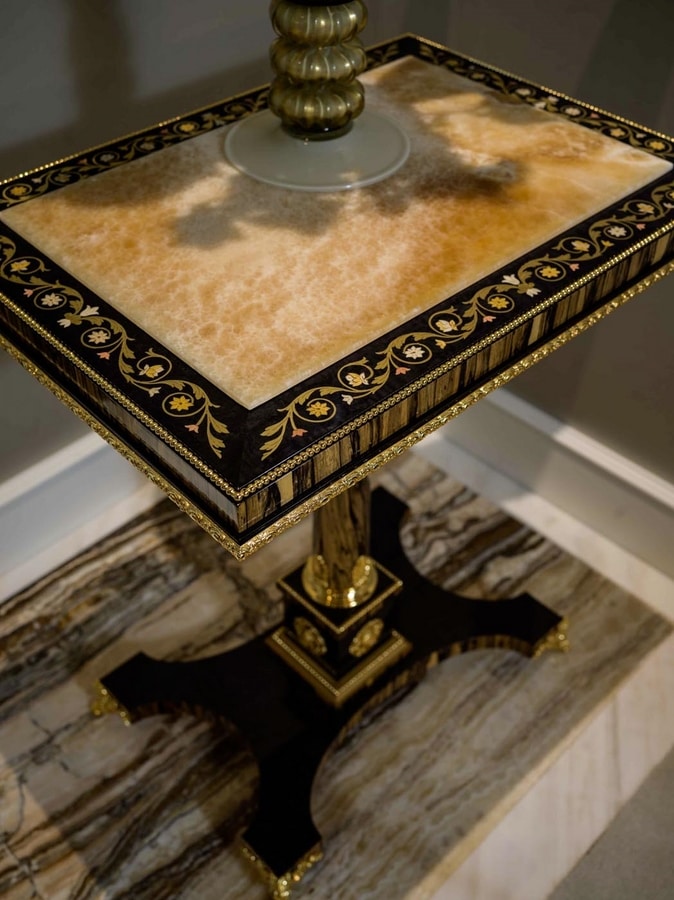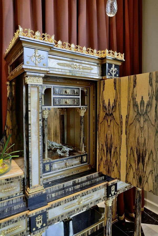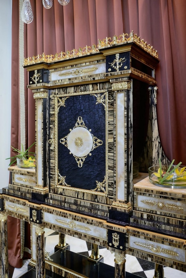 Massiver Tulpenschrank aus schwarzem Erable und weißem Ebenholz mit vergoldeten Bronzen, Marmor aus Honig-Onyx. Die Kombination verschiedener Essenzen in natürlichen Farbtönen und kostbaren Materialien wie Marmor, Bronzen und dem antiken Spiegel erwecken dieses luxuriöse und majestätische Stück zum Leben, das sich ideal für große Eingangsräume und Wohnzimmer eignet. Die gleichen Materialien werden in dem runden kleinen Tisch aus weißem Ebenholz mit Inlays aus Essenz und Messing, Onyx-Platte und fein gearbeiteten Messingapplikationen in Gold-Finish vorgeschlagen. Begleiten Sie den Schrank für luxuriöse Majlis.