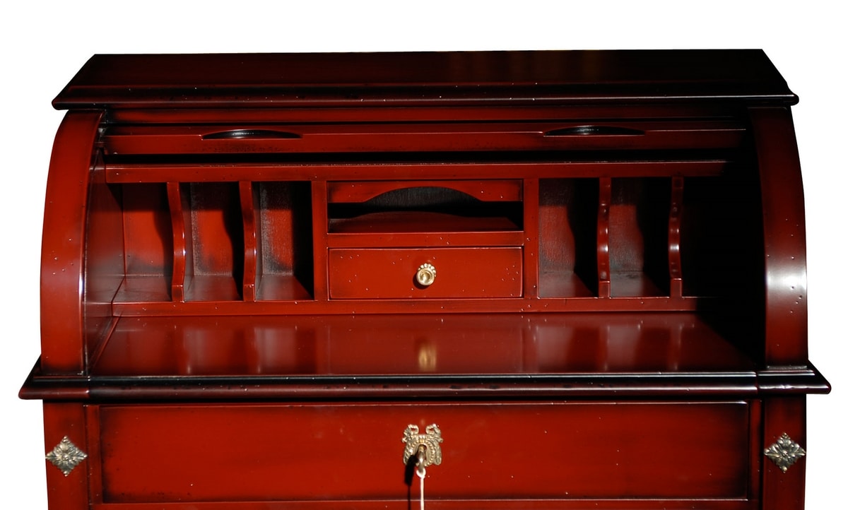 Louis XVI Rollschreibtisch aus Kirschholz, eine Schublade mit Schloss darunter, quadratische, sich verjüngende Beine mit Metalldetails und dekorativen Halterungen. Riser mit Rollladen, kleiner Schublade, offenen Fächern und ausziehbarer Ablage.