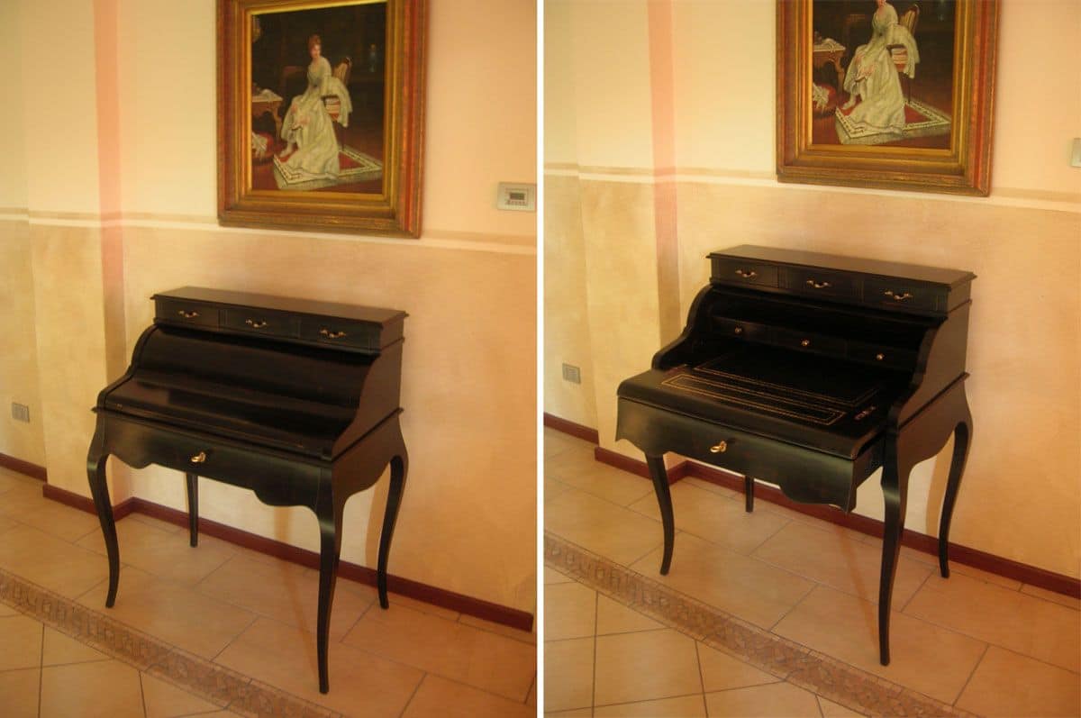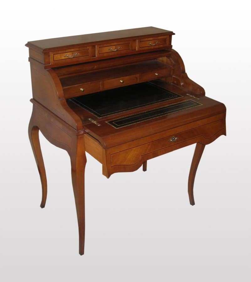 Accent Schreibtisch mit "roller" Öffnungsmechanismus in Nussholz mit Ahorn-Intarsien, Schreibtisch mit Leder-Top mit goldenen Kontur.