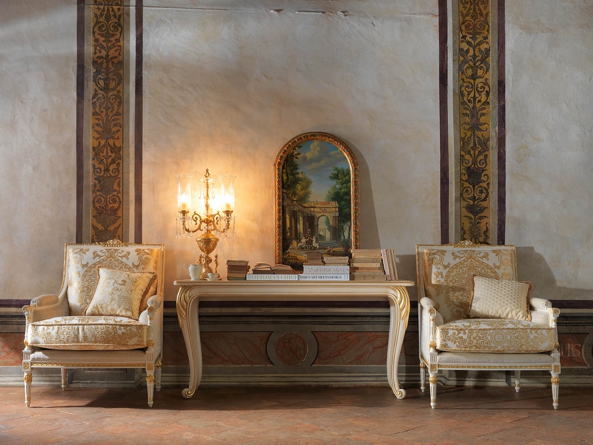 Geschnitztes Sessel mit einer eleganten und bequemen Linie. Das raffinierte Schnitzen erfolgt von Hand. Erhältlich in einer Vielzahl von Farben und Ausführungen für Holz.