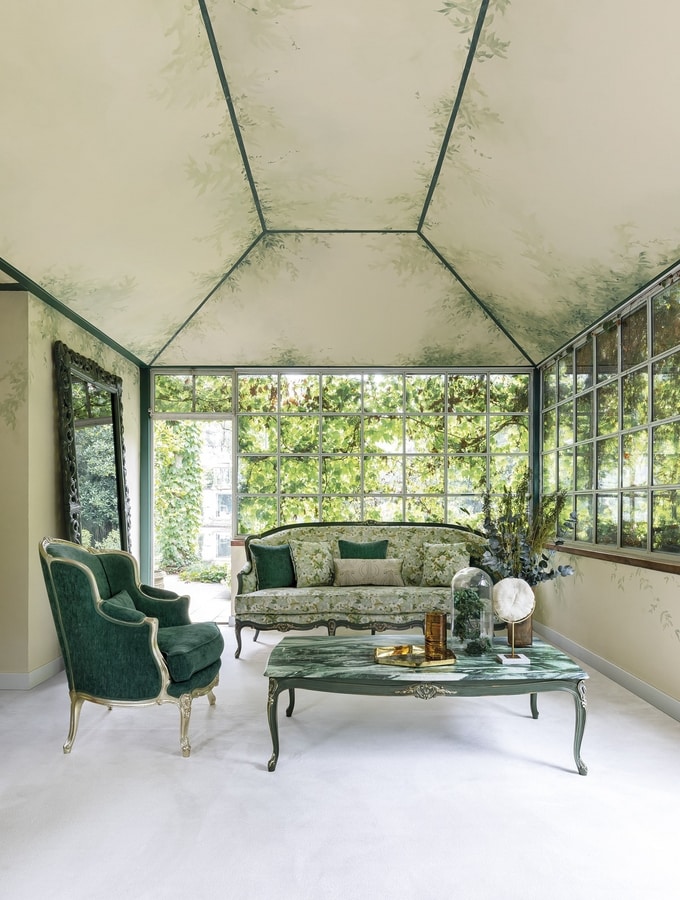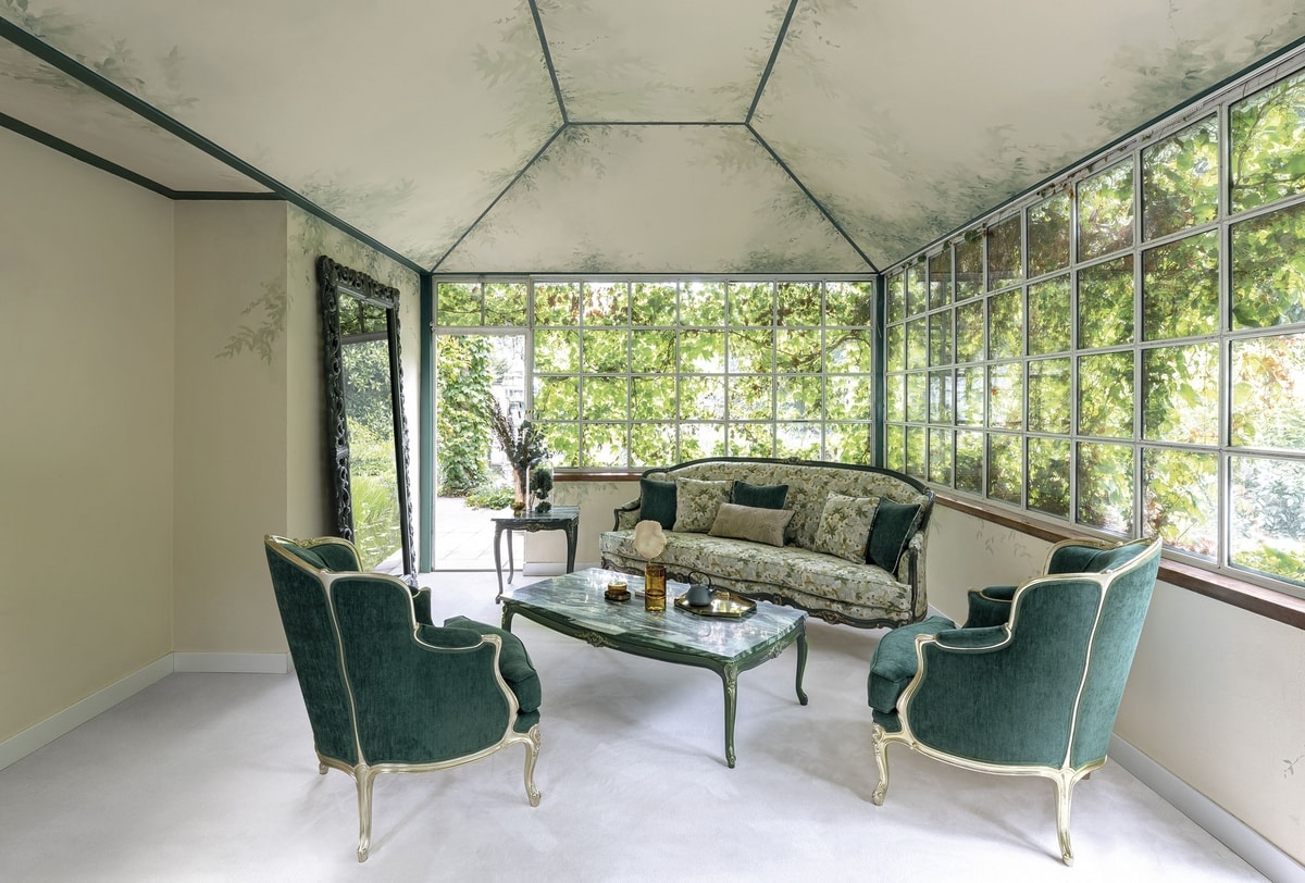 Ein Raum, dessen Farbthema Lotusgrün ist. Das bestickte Dreisitzer-Sofa, die beiden einfarbigen Sessel und der Marmor-Couchtisch in der Mitte verweisen auf diesen Farbton, der den vorherrschenden Louis-XV-Stil der Einrichtung mildert.