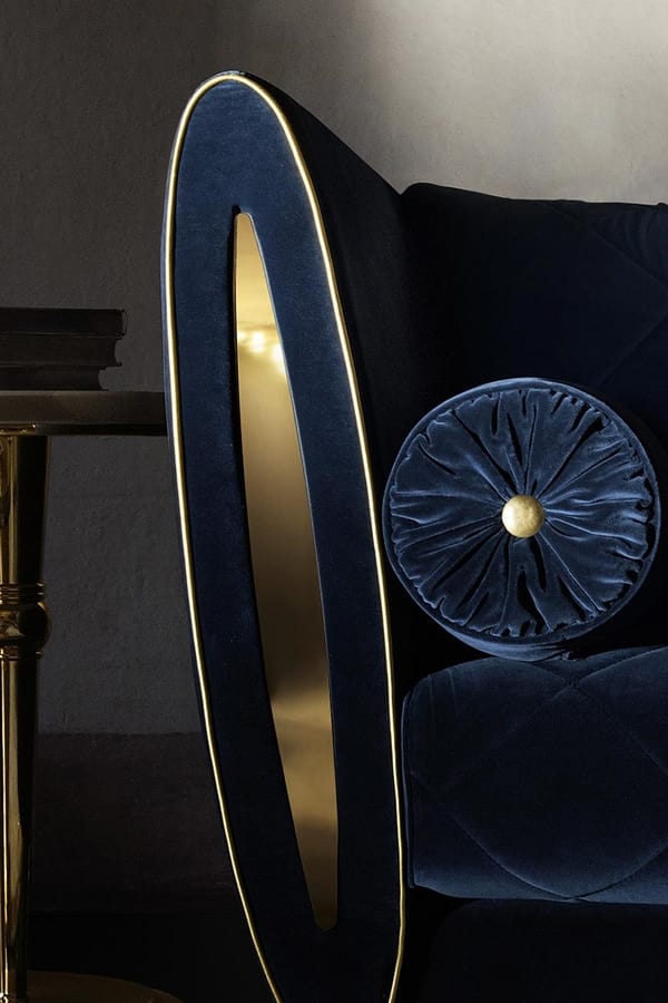 Die Sipario Kollektion Sessel haben eine kompakte und raffinierte Silhouette. Die Sitze sind breit und tief und balancieren die durchgezogene Linie des Rückens aus, die in eine weiche Kurve mündet, die die Armlehne bildet. Die Kontinuität dieses Merkmals macht es kompakt und passend genug für verschiedene Kontexte, von traditionellen Lösungen bis zu intensiveren Kontrastkontrasten, die das zeitgenössische Element der Messingellipse, charakteristisch für die Armlehne, hervorheben. Die Sessel sind mit weichen Kissen geschmückt, die ebenso wie funktionale, wie auch das Kissen rund um die Sitzmöbel und der reizvolle Kontrast zu den goldenen Tönen des quadratischen Kissens, dekorativ sind.