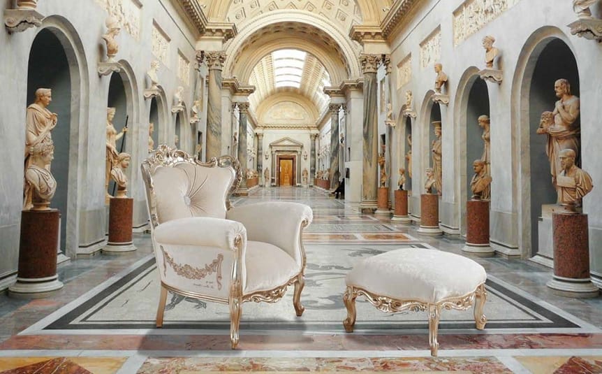 Sessel im Barockstil. Die Besonderheit dieses Modells ist der Swarovski-Knopf in der Mitte der Rückenlehne und die Stickerei in der Seite der Armlehne. Es ist möglich, es mit einer Stickerei nach Kundenwunsch zu personalisieren. Stamm in Buche. Erhältlich in jedem Finish: lackiert oder im Blatt.