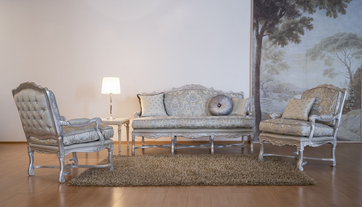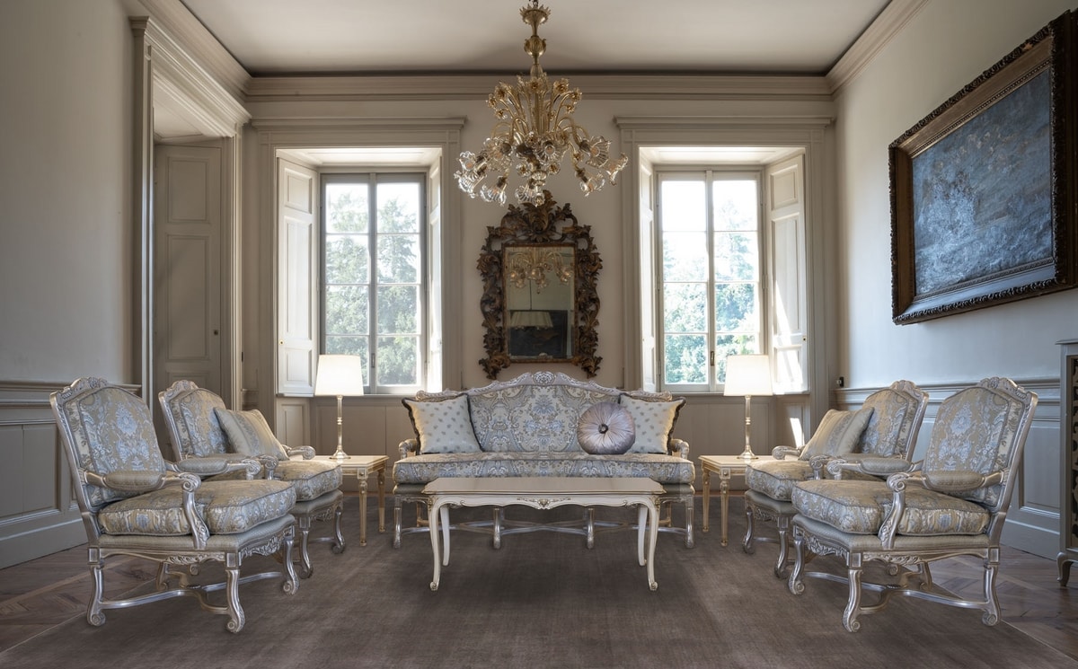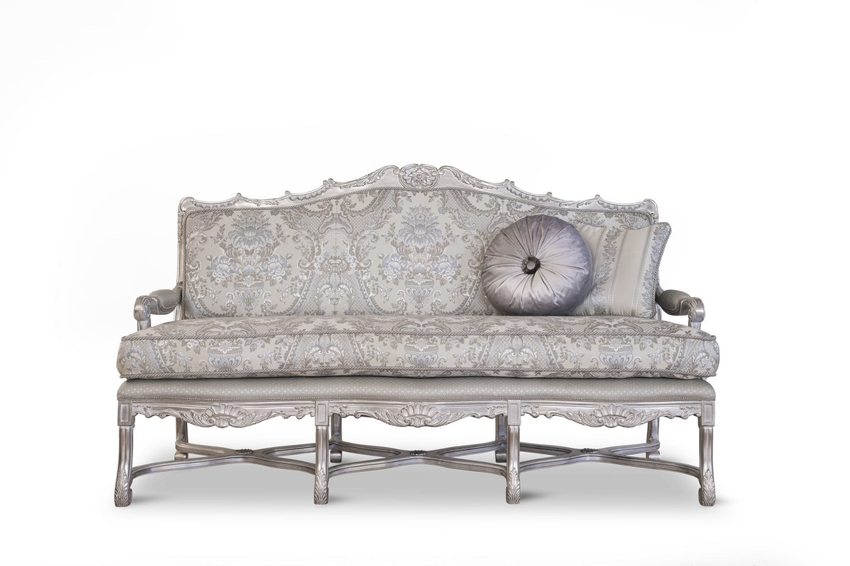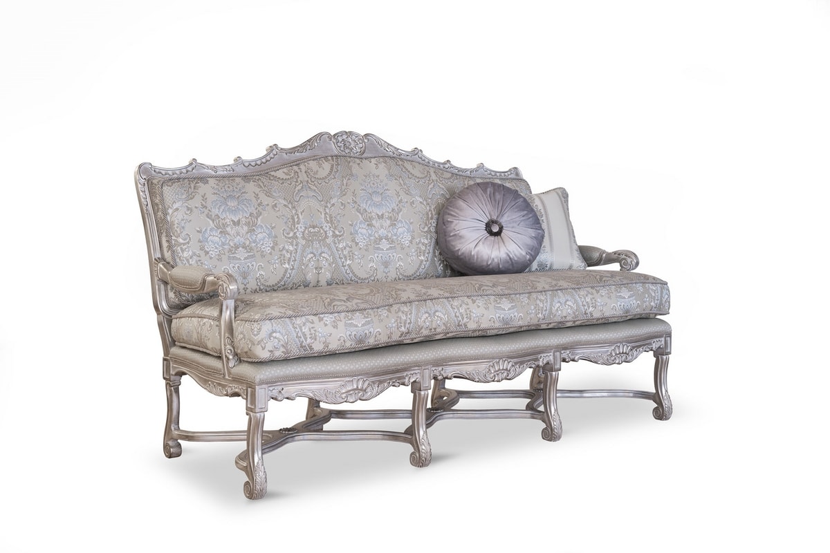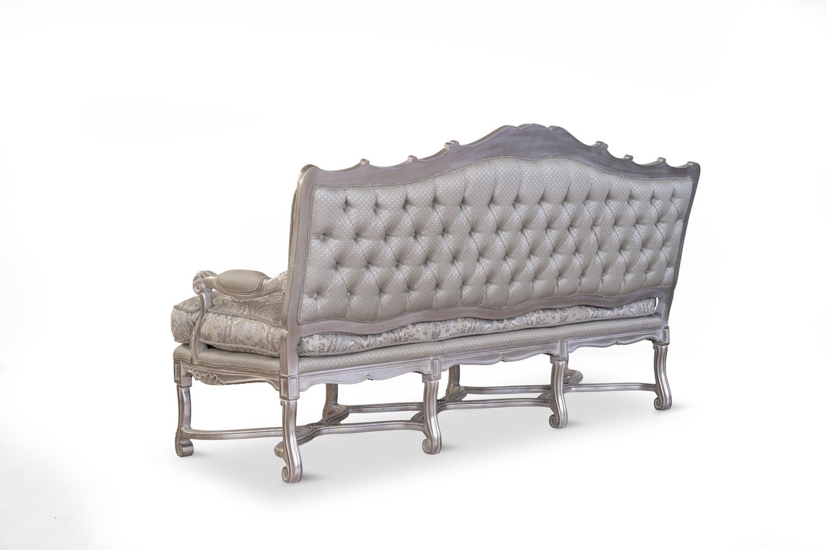 Vollständig handgeschnitztes Sofa mit solider Struktur. Hergestellt aus den besten Stoffen in Übereinstimmung mit der Tradition des Made in Italy. Eine große Auswahl an Holzoberflächen und Stoffen steht zur Verfügung.