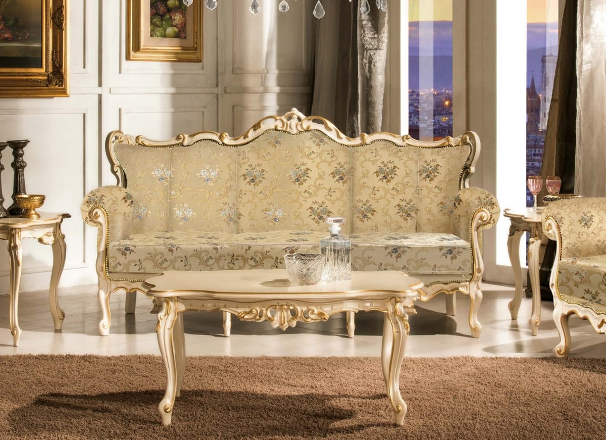 Delux Sofa im klassischen Stil. Holzkonstruktion mit Schnitzereien, Stoffbezügen.