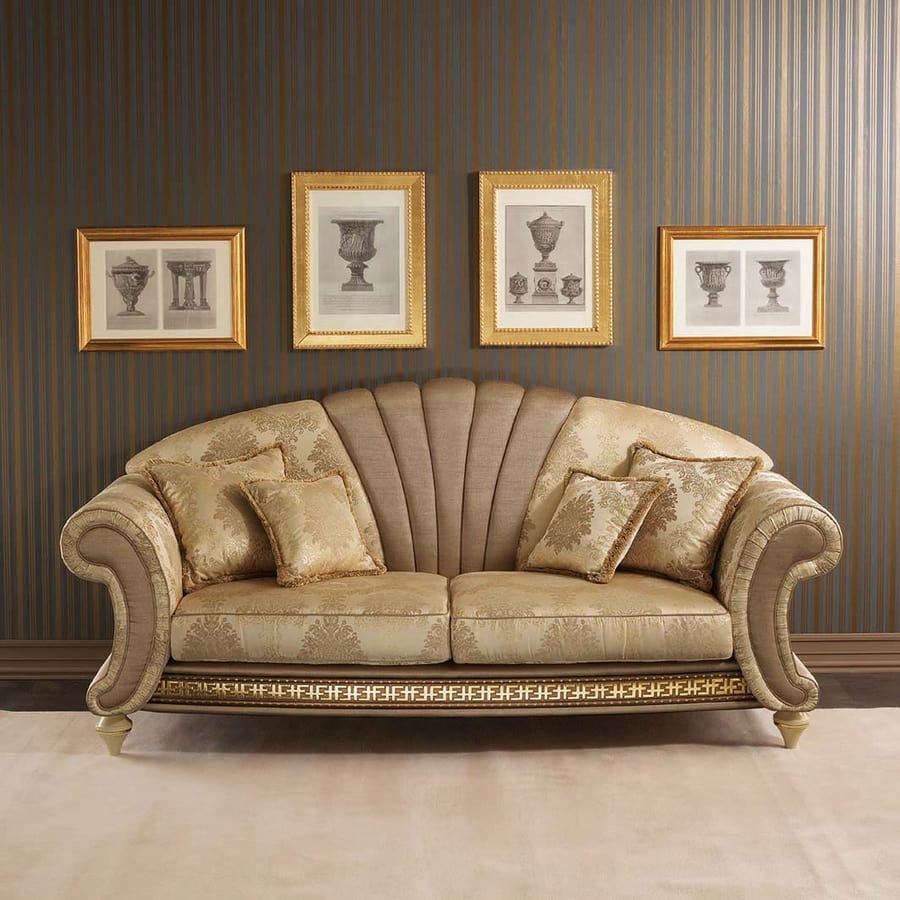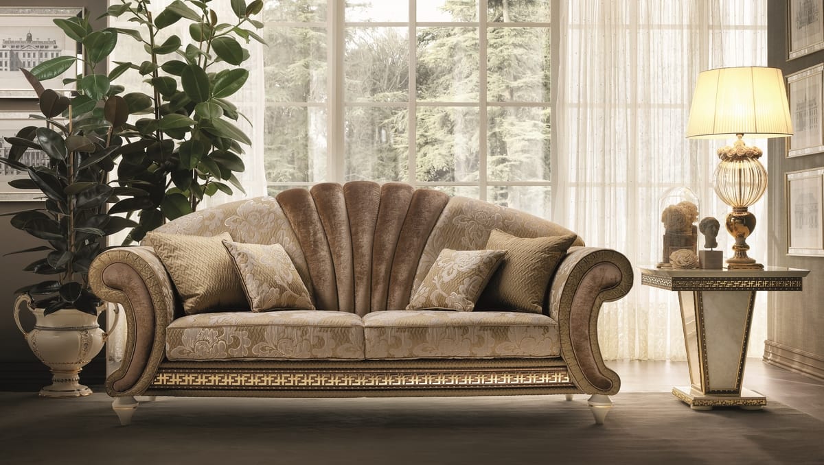 Die Wohnzimmermöbel verfügen über diese luxuriösen Sofas, die einen elegant geselligen Raum schaffen. Die weichen Linien und das zentrale fächerförmige Paneel geben diesem Sofa eine starke ästhetische Wirkung, die zeigt, dass es sich um ein Möbelstück von großem Wert handelt.