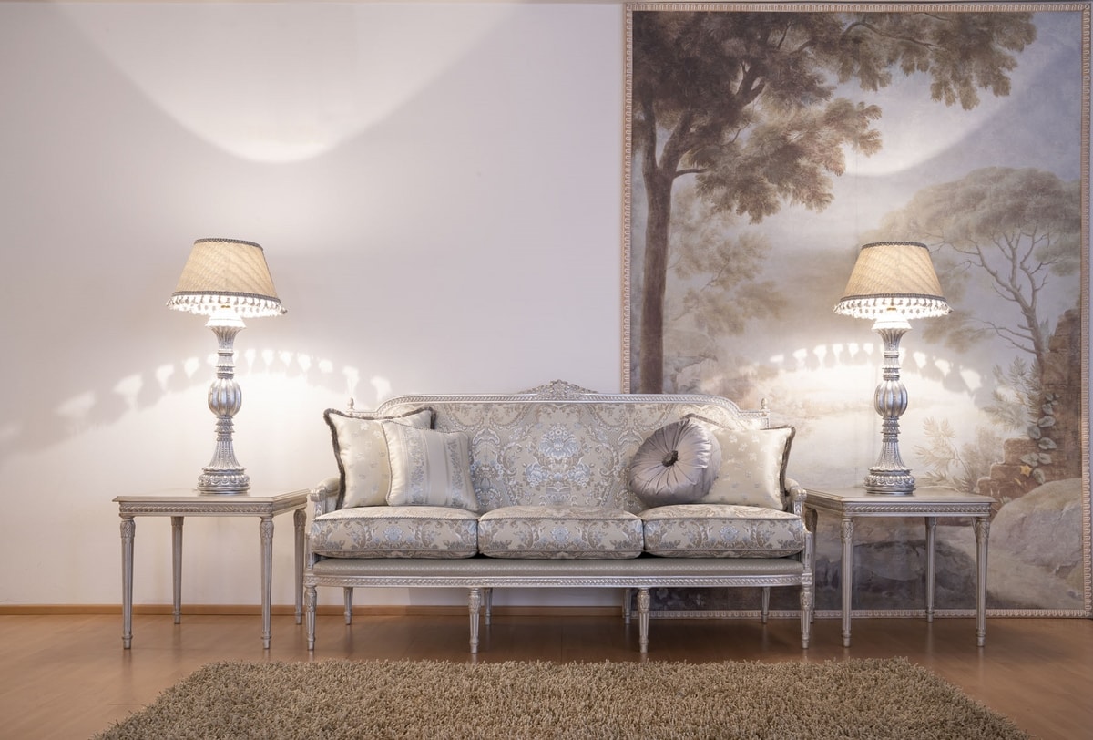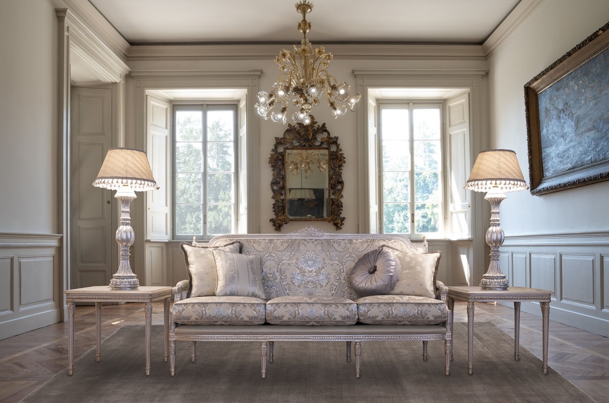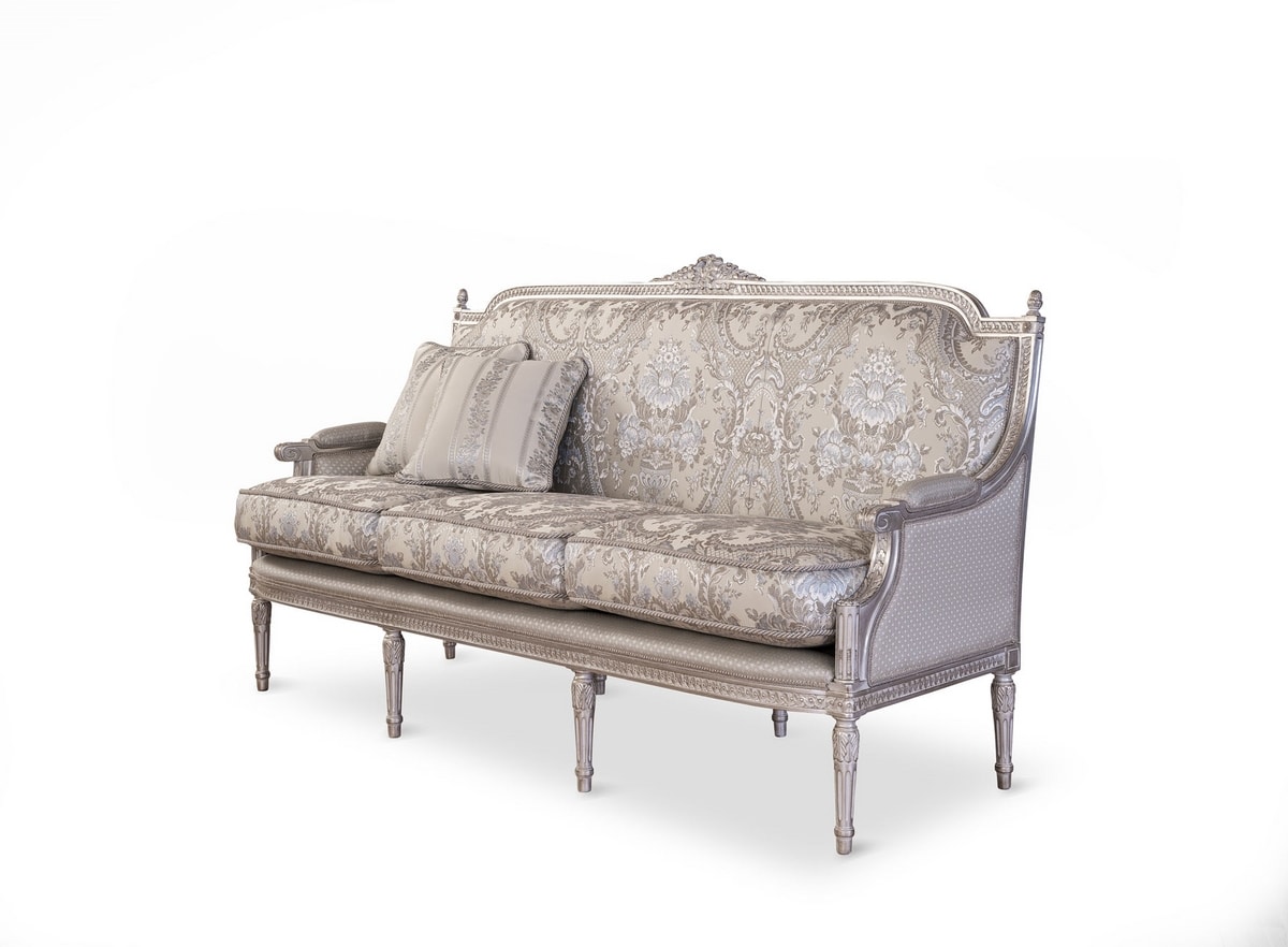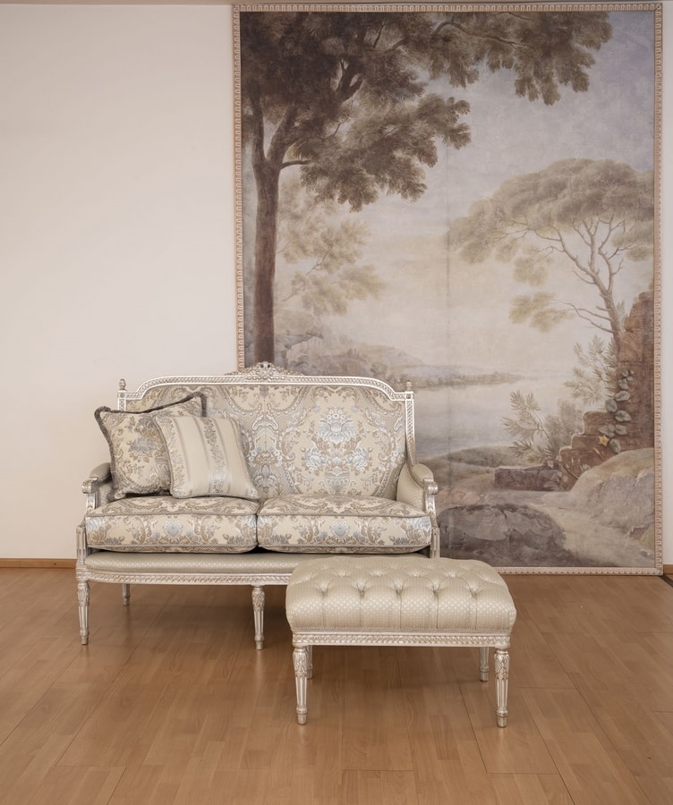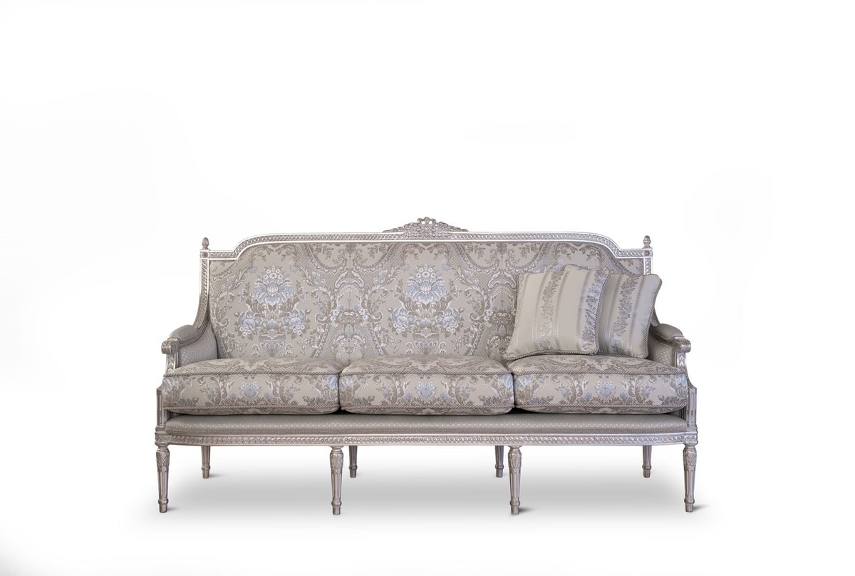 Sofa im Louis XVI-Stil mit einem eleganten und königlichen Aussehen. Die Schnitzerei von ihm, vollständig von Hand gefertigt, verleiht ihm Eleganz und Finesse. Erhältlich in einer breiten Farbpalette für Stoff- und Holzoberflächen.
