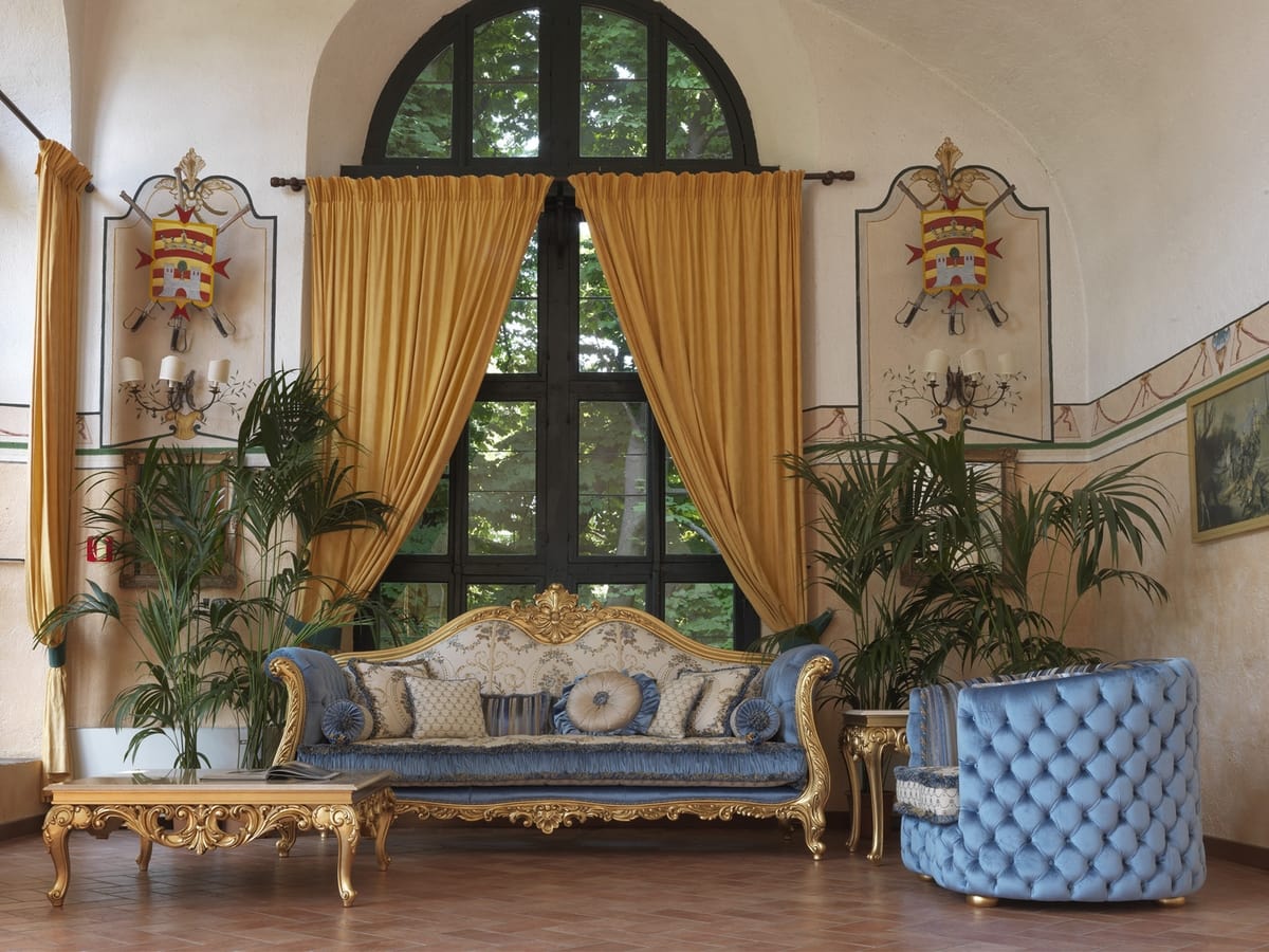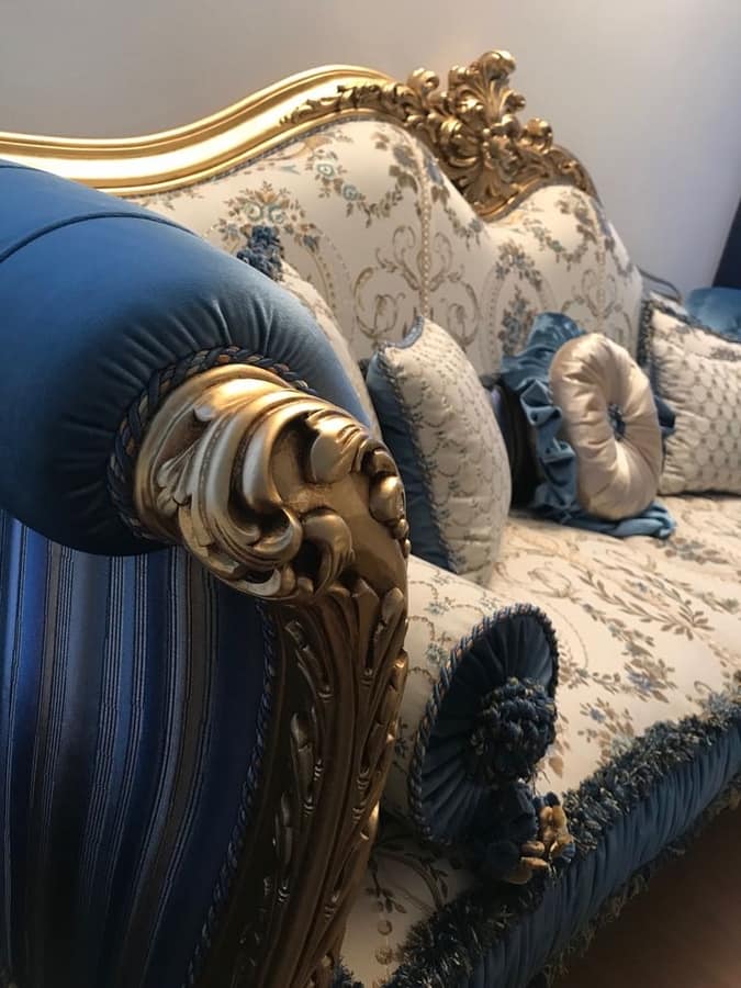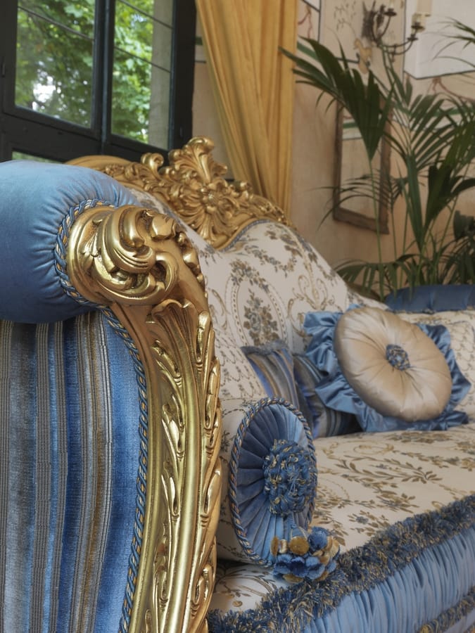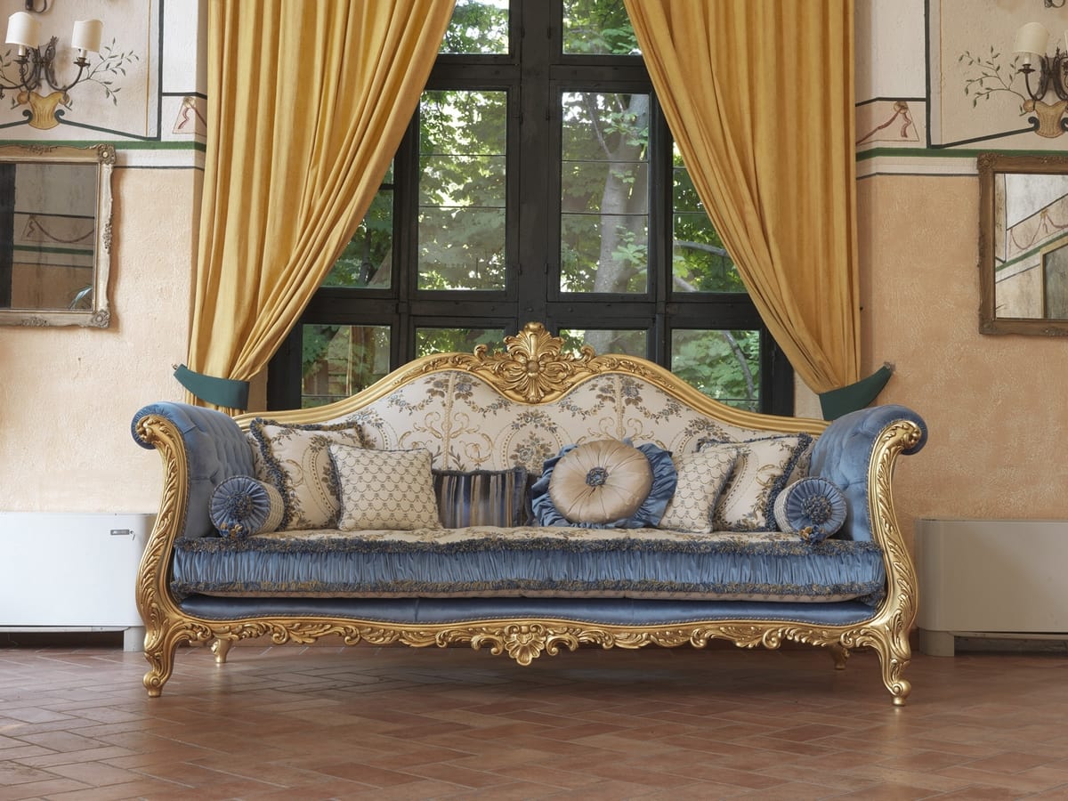Sofa voll handgeschnitzt mit robuster Struktur. Gemacht mit den feinsten Stoffen, die die Tradition in Italien betreffen. Es gibt eine große Auswahl an Oberflächen für Holz und Stoffe.