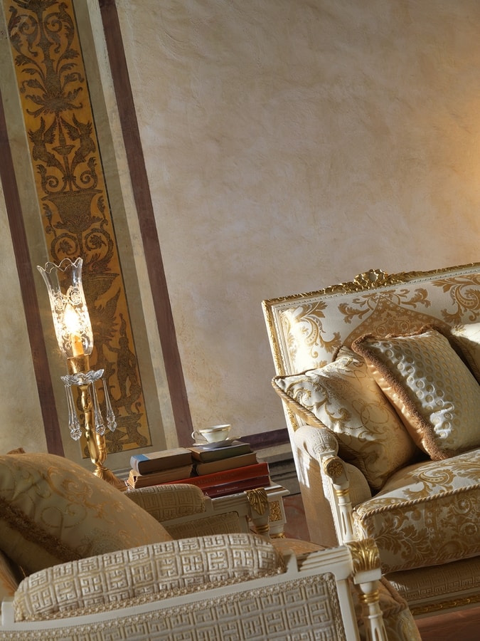 Geschnitztes Sofa mit einer eleganten und bequemen Linie. Das raffinierte Schnitzen erfolgt von Hand. Erhältlich in einer Vielzahl von Farben und Ausführungen für Holz.