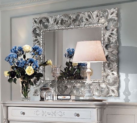 Spiegel aus geschnitztem Holz, ganz aus Blattsilber.