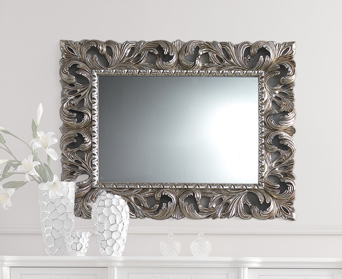 Rechteckiger Spiegel aus geschnitztem Holz, ganz aus Blattsilber.