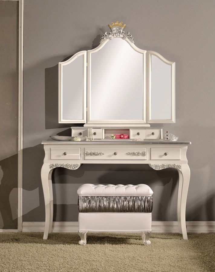 Klassischer Stilspiegel mit Holzstruktur und Rahmen. Angereichert mit kostbarem Argument und Blattgold. Ausgestattet mit zwei verstellbaren Seitenspiegeln. Ideal, um mit einem Schminktisch kombiniert zu werden.
