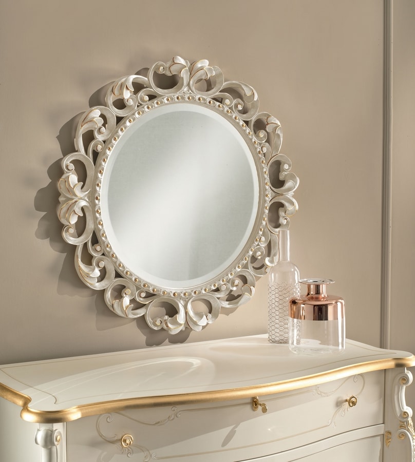 Runder Spiegel geschnitzt, lackiert mit Blattgolddetails.